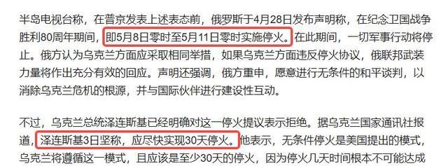 泽连斯基指出,30小时停火过于短暂,不足以建立信任,提议延长至30天,并要求俄方全面无条件停火。