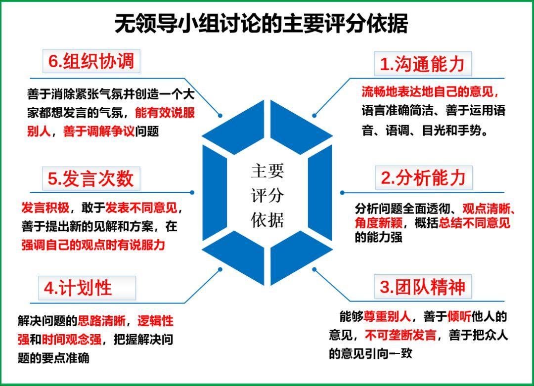 (5)引领全局者——要扮演一个成功的领导者,不仅是对别人发号施令这么简单,而必须要靠自己的能力和魅力来征服自己小组的成员和考官。因为如果自己的能力不是很强,或是不够尊重其他的考生,那么不但其他的考生会不服气,而且也不会受到考官的青睐。如果你是个逻辑思维强,表达能力好,整理框架多,时间观念强,组织协调优的气场选手,放心就做。