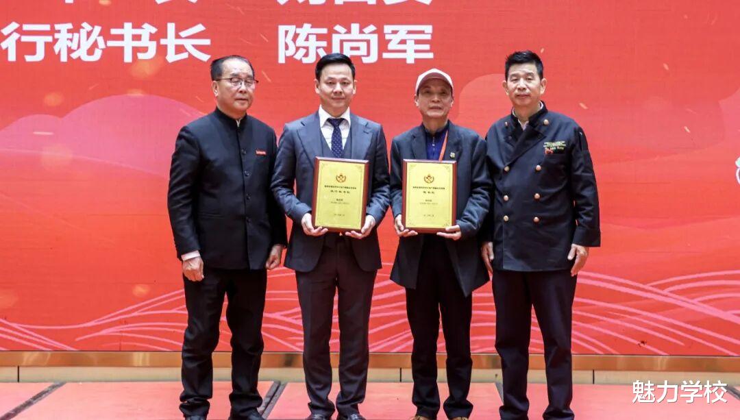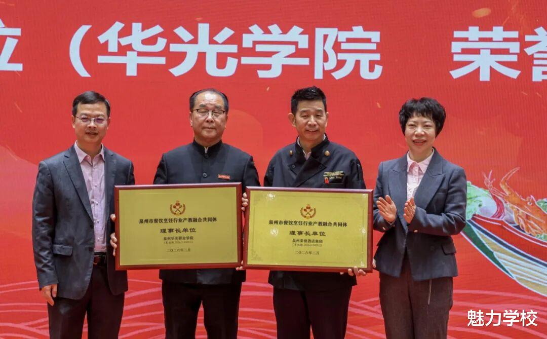 泉州市商务局二级调研员简国红、泉州市教育局二级调研员陈军宣向华光学院创始人吴其萃教授和荣誉集团厨政总裁胡满荣大师颁授共同体牌匾。