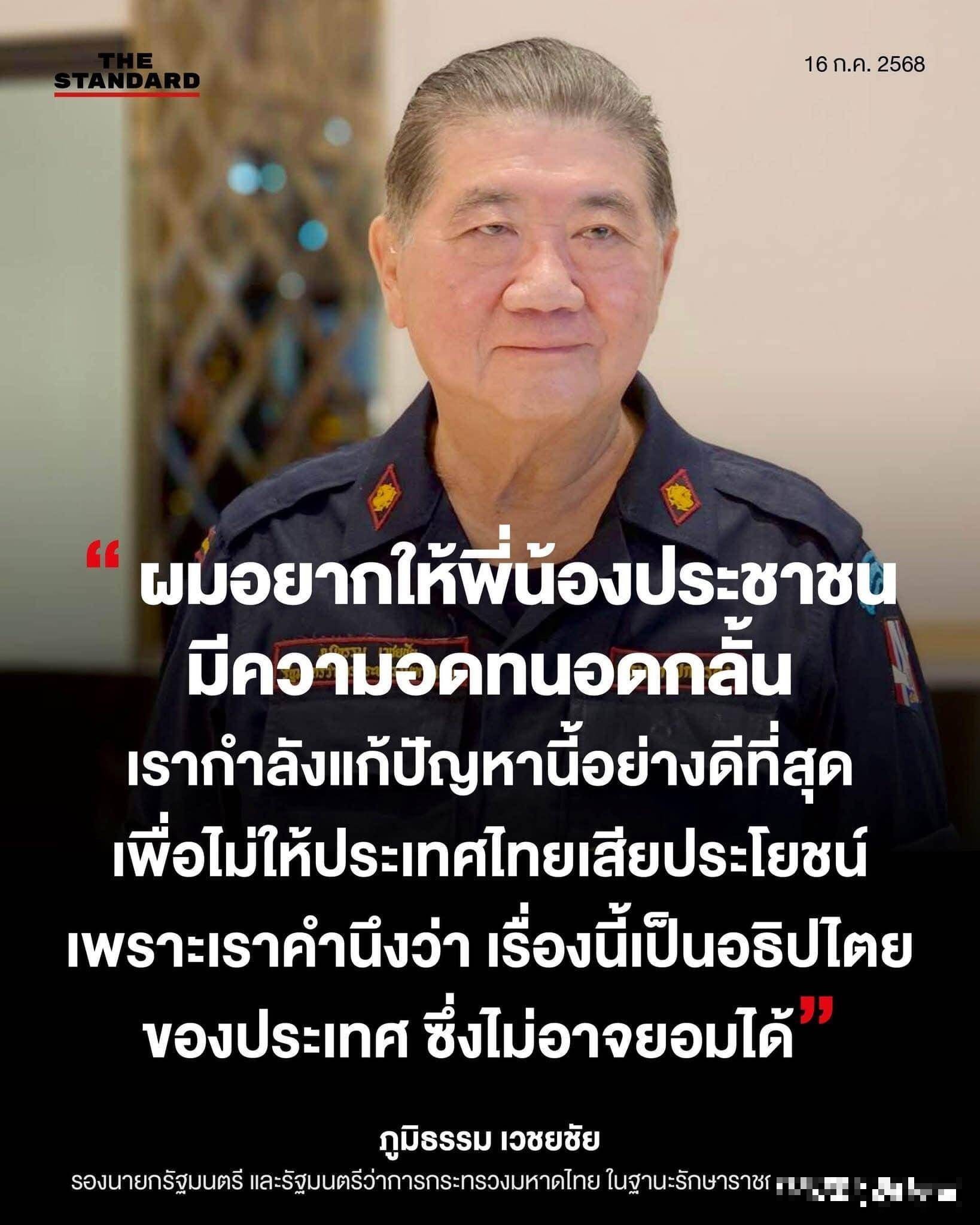 最后,普唐重申:“泰方将始终坚持依据国际法与洪玛奈政府进行沟通,而不是对洪森发表声明。”他呼吁人民保持耐心和冷静,向公众保证政府正在尽全力解决这一问题,绝不会让泰国受到损失。他最后强调,国家主权不可侵犯,无论与任何个体或国家的关系如何,泰国对于领土问题绝不可妥协。如果遭到侵犯,泰国政府必将做出全面的应对。
