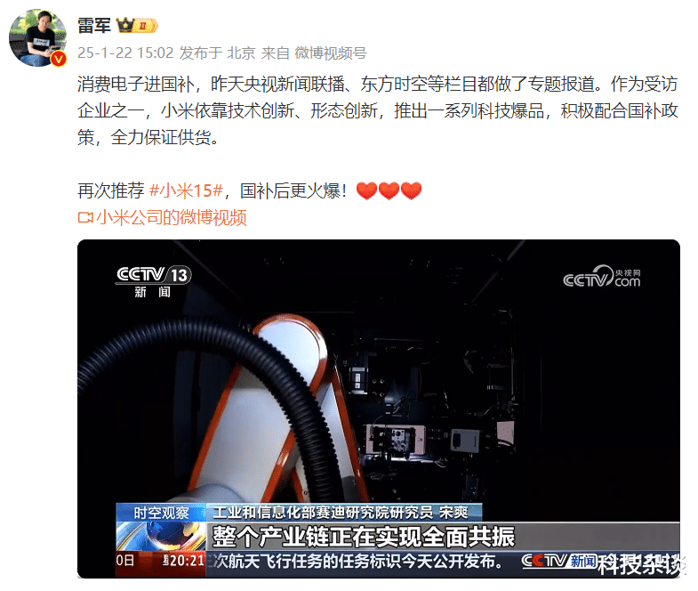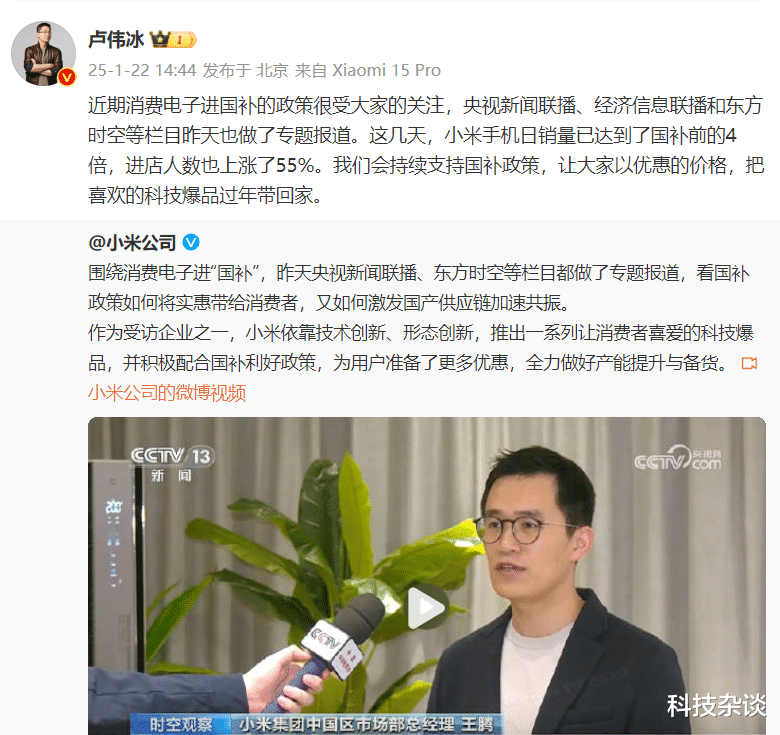 对于这一次王腾与小米工厂登上央视新闻,雷军与卢伟冰都表态了。雷军表示:消费电子进国补,央视新闻联播、东方时空等栏目都做了专题报道。作为受访企业之一,小米依靠技术创新、形态创新,推出一系列科技爆品,积极配合国补政策,全力保证供货。最后他再次推荐小米15这款手机,并表示国补之后更火爆了。信息显示截至1月12日小米15系列的激活量已经突破200万台,是年度这波旗舰之中销量最高的产品,这一次国补后最低到手价为3999元,确实销量更火爆了,怪不得雷军要讲全力保证供货呢?