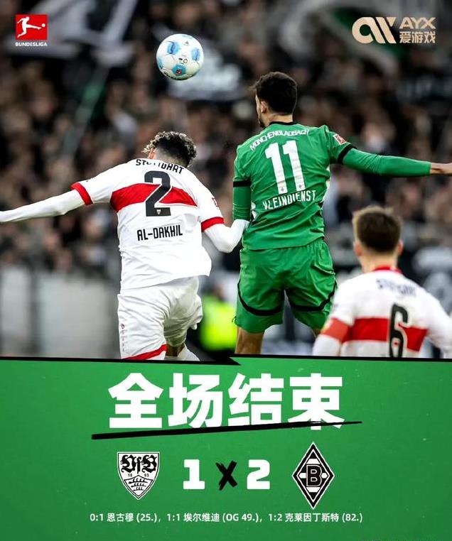比赛开始后,双方互有攻守,但门兴格拉德巴赫反客为主率先打破僵局,由魏格尔挑传助攻恩古穆破门,半场1-0领先;下半场易边再战,斯图加特终于扳平比分,第50分钟,拉森横传造成埃尔维迪乌龙;不过他们未能守住一场平局,比赛接近尾声时,克莱因丁斯特破门帮助门兴格拉德巴赫完成逆转,最终斯图加特1-2惨遭门兴格拉德巴赫绝杀!