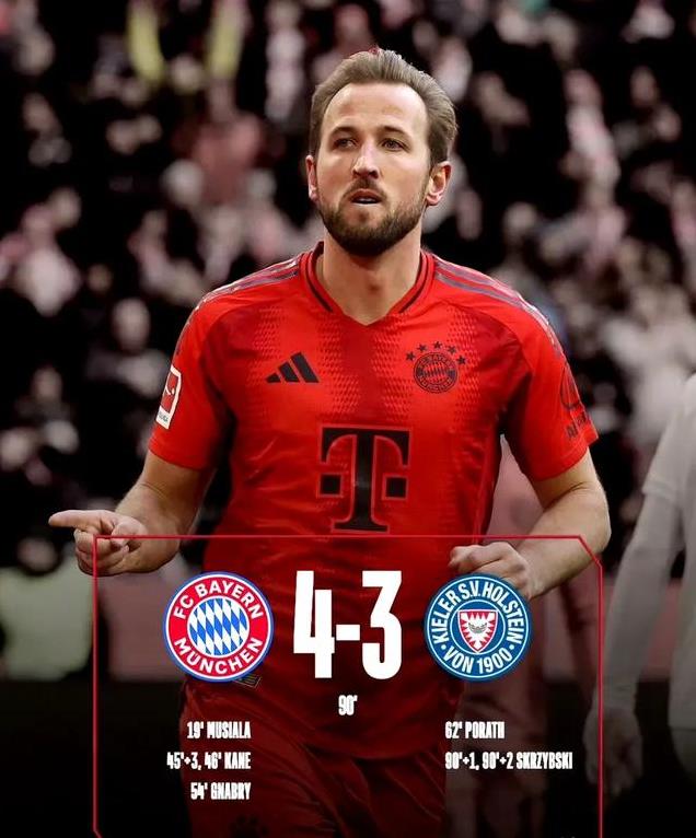 下半场刚开场1分钟,拜仁就迎来梦幻开局,格雷罗接科曼回做球后不停球直接传中,凯恩头球破门完成梅开二度;8分钟后,格纳布里抓住对方禁区内解围失误直接一脚凌空抽射破门,帮助拜仁4-0领先;之后客队连扳三球,但还是未能改变败局,最终拜仁4-3险胜荷尔斯泰因基尔,迎来联赛5连胜!