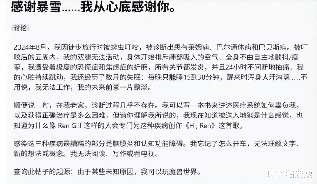 根据博主的分享,他在去年8月的时候因为徒步旅行被蜱虫叮咬,患上了莱姆病、巴尔通体病和巴贝斯病,遭受了身心的折磨。其中,最让博主难过的是,因为这三种疾病,又患上了脑膜炎和认知功能障碍,导致他无法理解文字并忘记了一些生活必备的技能。
