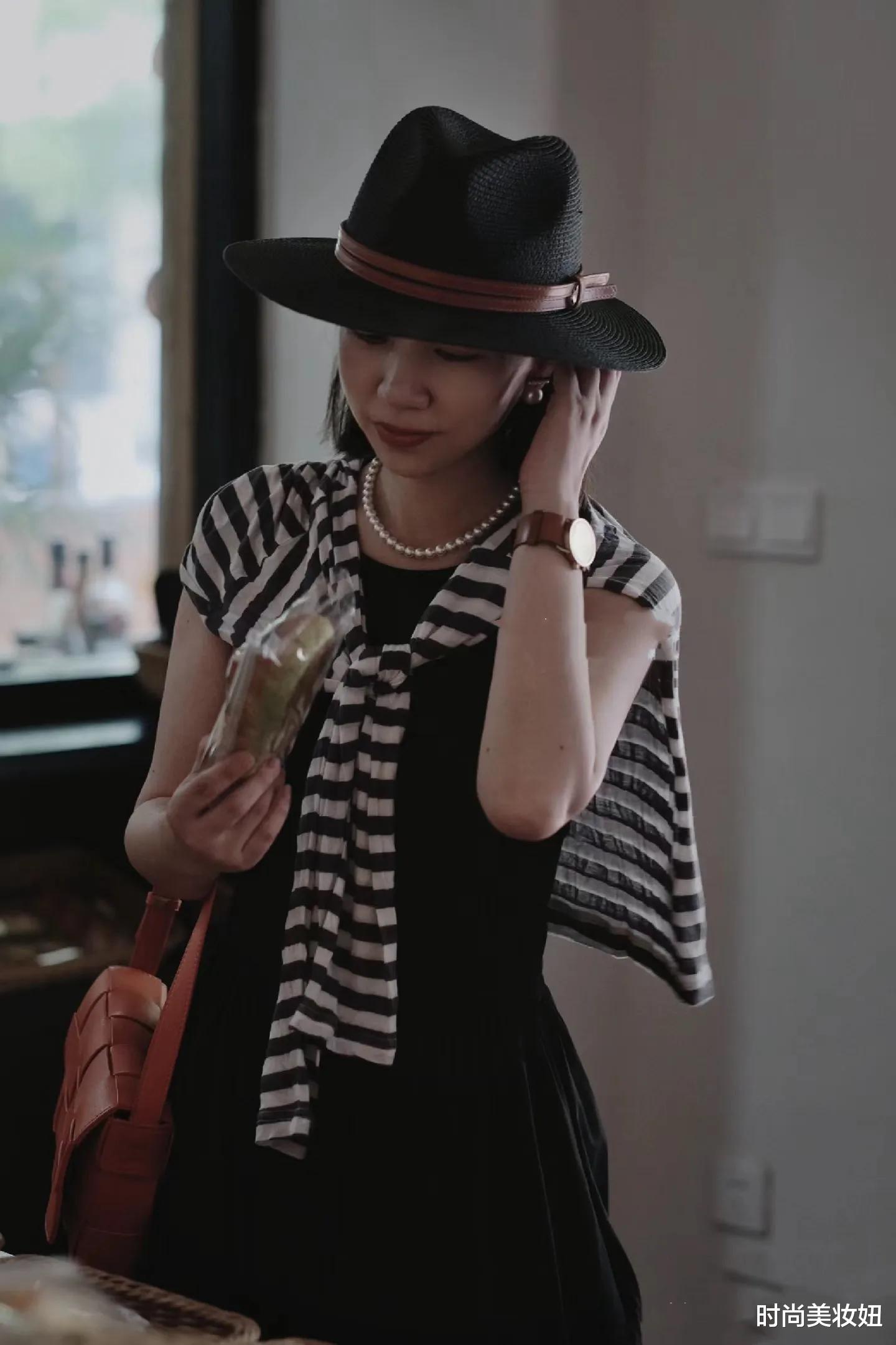 如果想把纯黑色连衣裙增加点色彩或层次感的话,也可以通过搭配来达到,比如一件黑白条纹的针织衫或披肩,黑白条纹做到了呼应效果,也达到了提亮的作用,而且这样搭配更具时尚气息,黑白条纹的加入,瞬间打破了纯黑色的单调,为整体造型注入活力。是披在肩上还是系在腰间,条纹元素都能为造型增添层次感,让整体look更加丰富。黑白条纹本身就是经典元素,与小黑裙搭配,更是将经典进行到底,永不过时。快拿出你衣橱里的小黑裙,尝试一下这种搭配吧,相信你会爱上这种全新的风格!