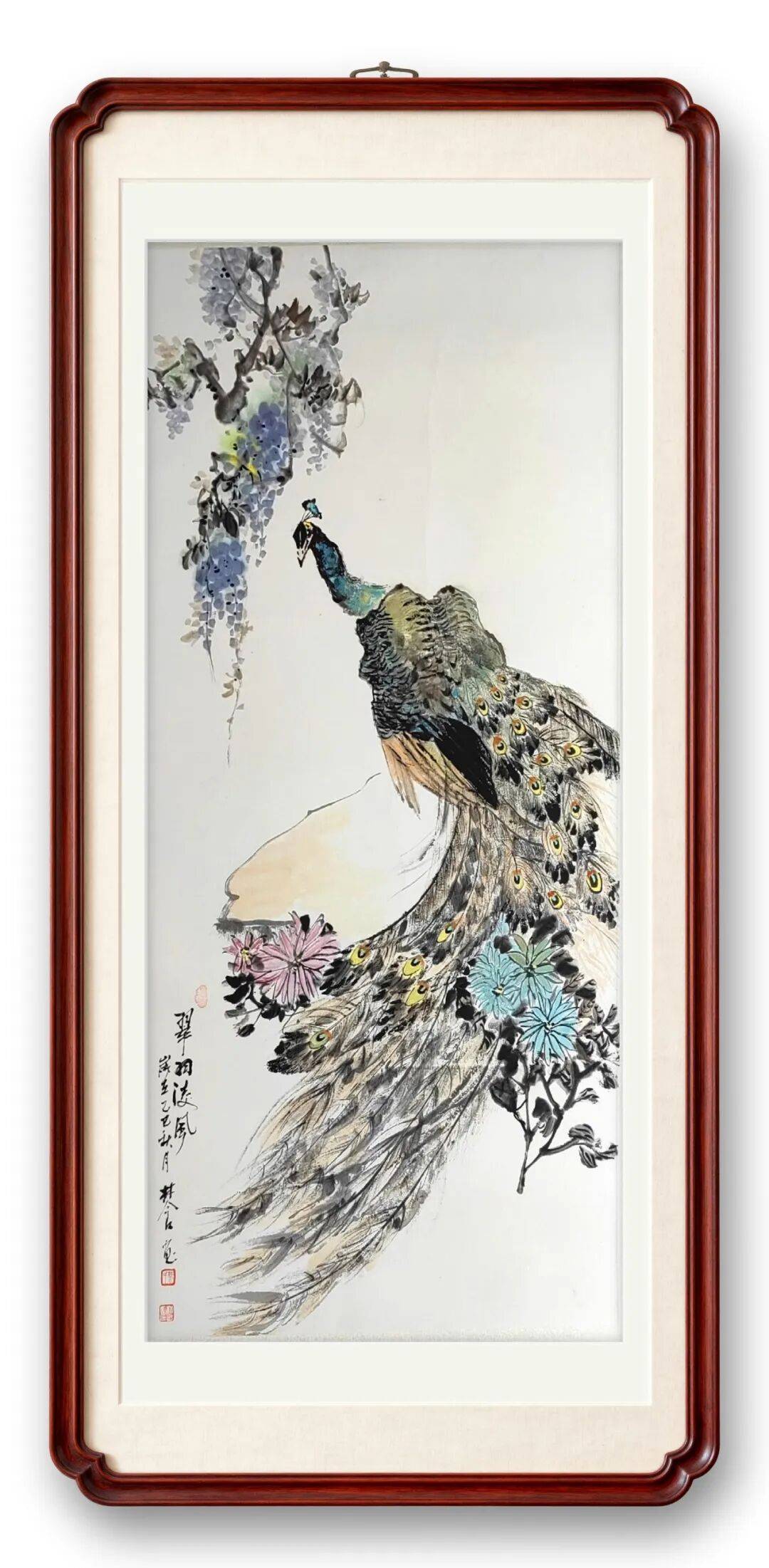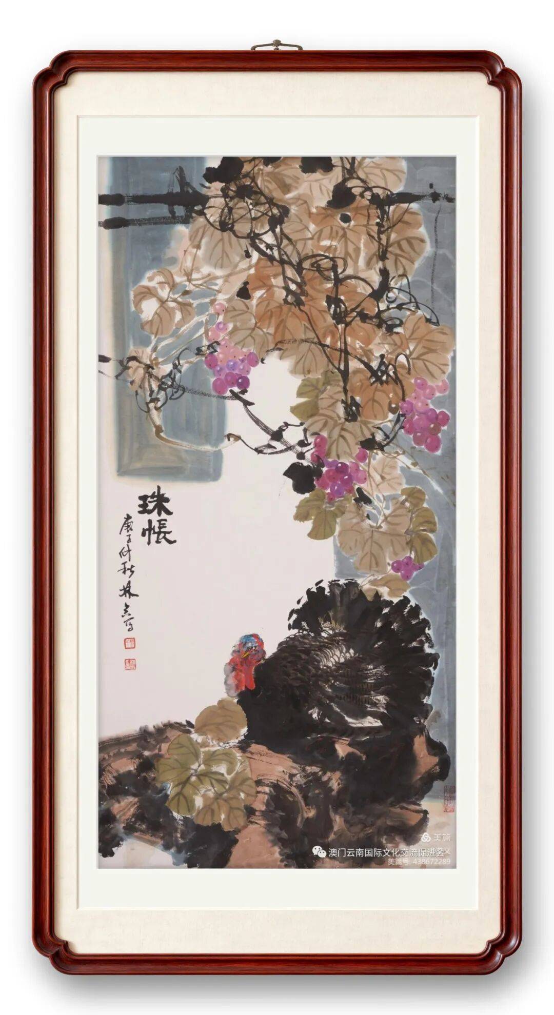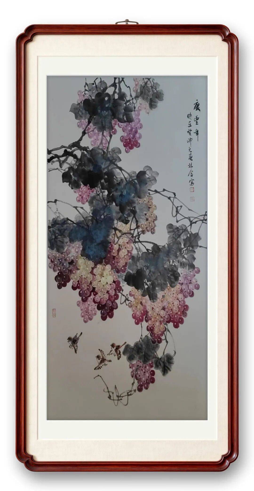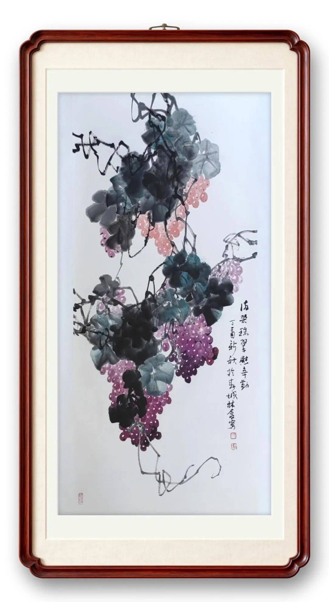 蔡林含亦擅写意葡萄,笔下串串硕果如珠似玉、晶莹剔透、饱满丰盈。她的葡萄画作章法整饬,浓淡虚实相生、节奏韵律灵动,色彩丰富而不杂乱,主调鲜明、清雅和谐,摒弃浮华匠气,于形神兼备中见霜粉质感,似触手可及、飞鸟可啄,既有传统笔墨意趣,又融中西造型之法,借色彩、透视与光影表现质感与立体层次,画面凝重深远、意韵悠长。观之满目丰收之喜,既满足审美之趣,亦暗含吉祥和美之愿。