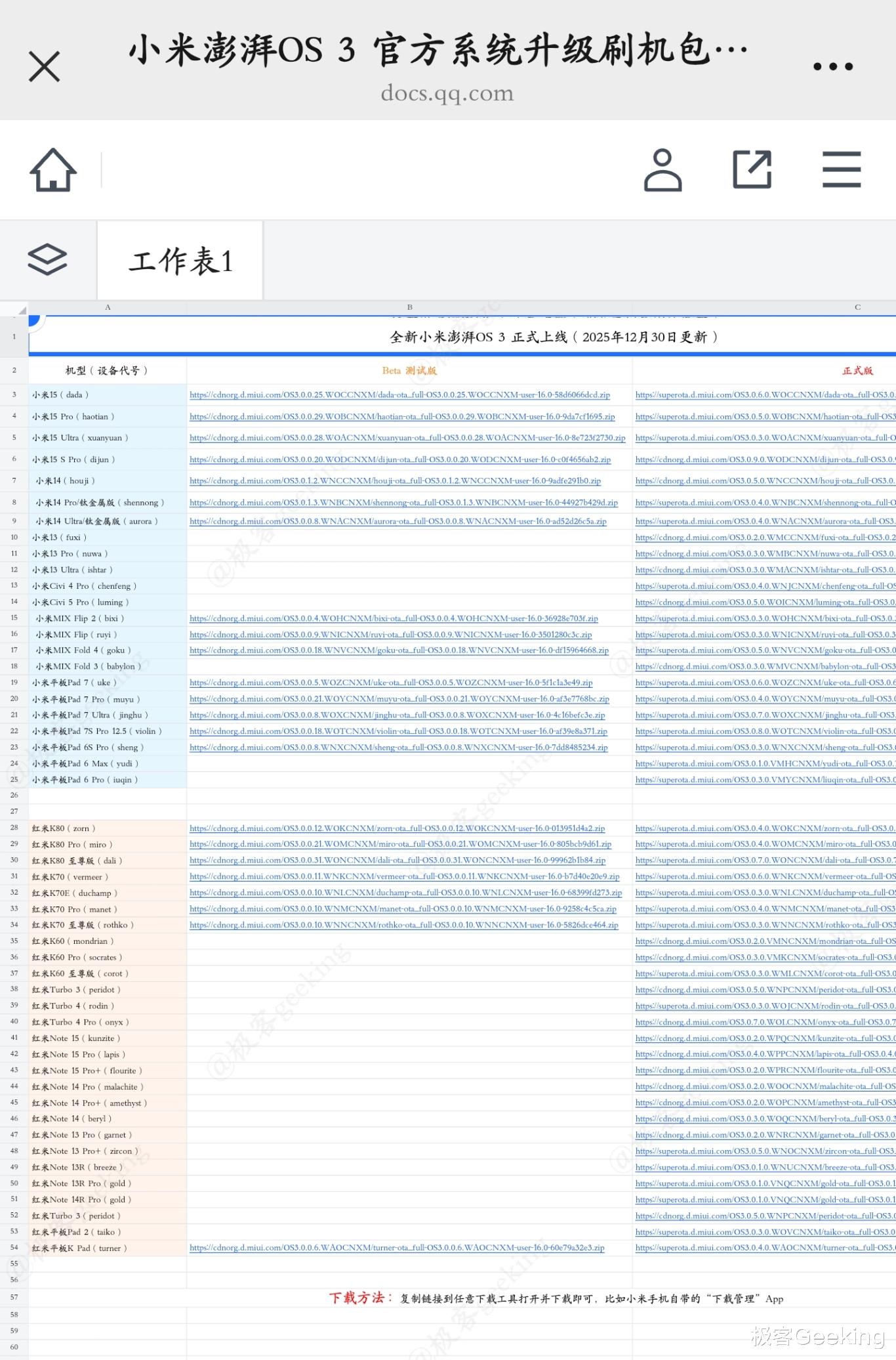 就像初代和澎湃OS 2,这次极客君依然做了一个在线文档,持续更新小米澎湃OS 3 的系统包下载链接,拥有 Beta 版和正式版,包括所有已适配升级的手机和平板设备,关注我并私信发送口令 “澎湃OS3” 即可获取。