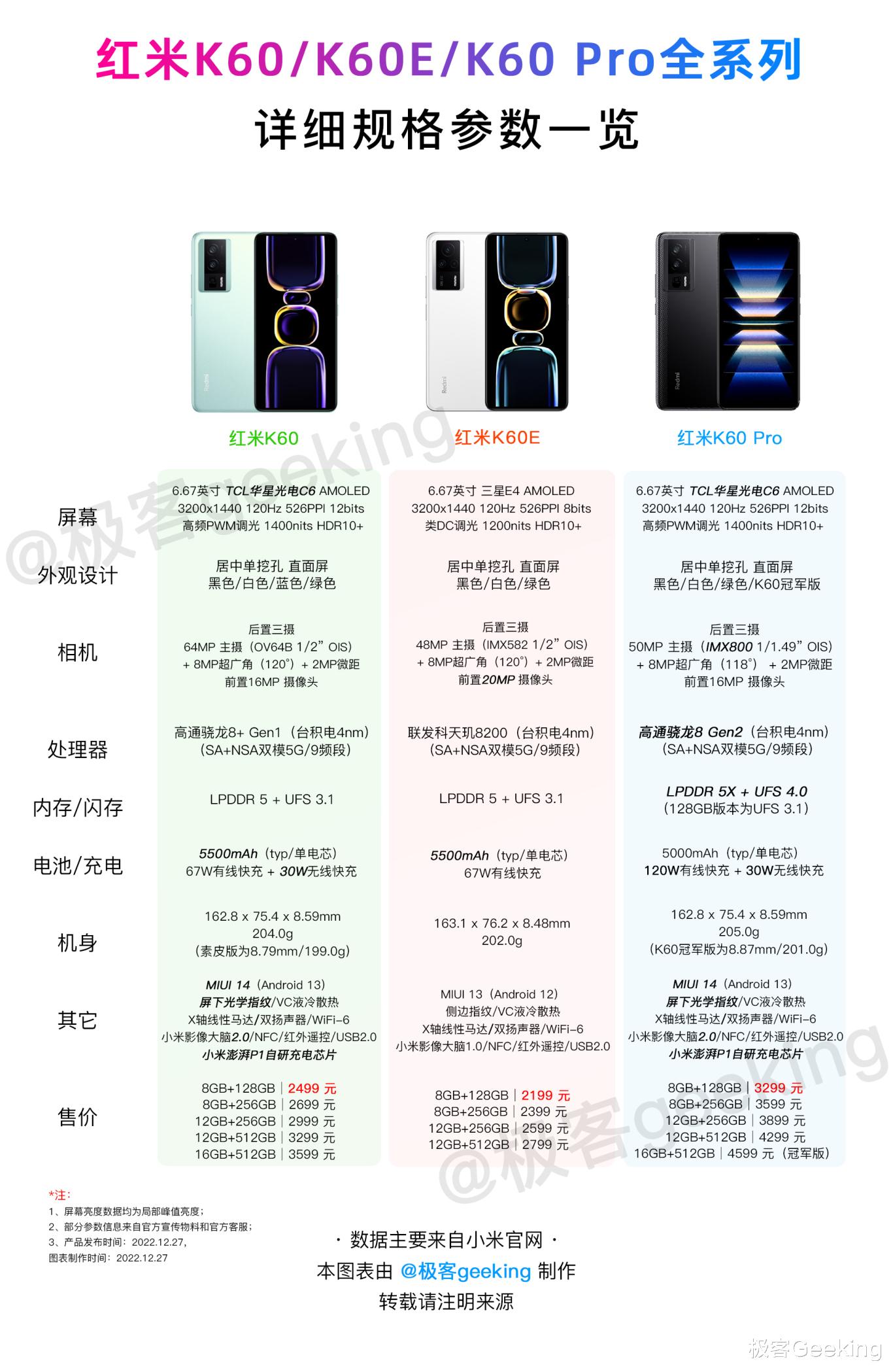比如其中的红米K60 系列,三款机型分别搭载不同的处理器平台,这里附上红米K60 系列三款旗舰手机的一张图配置完全总结图: