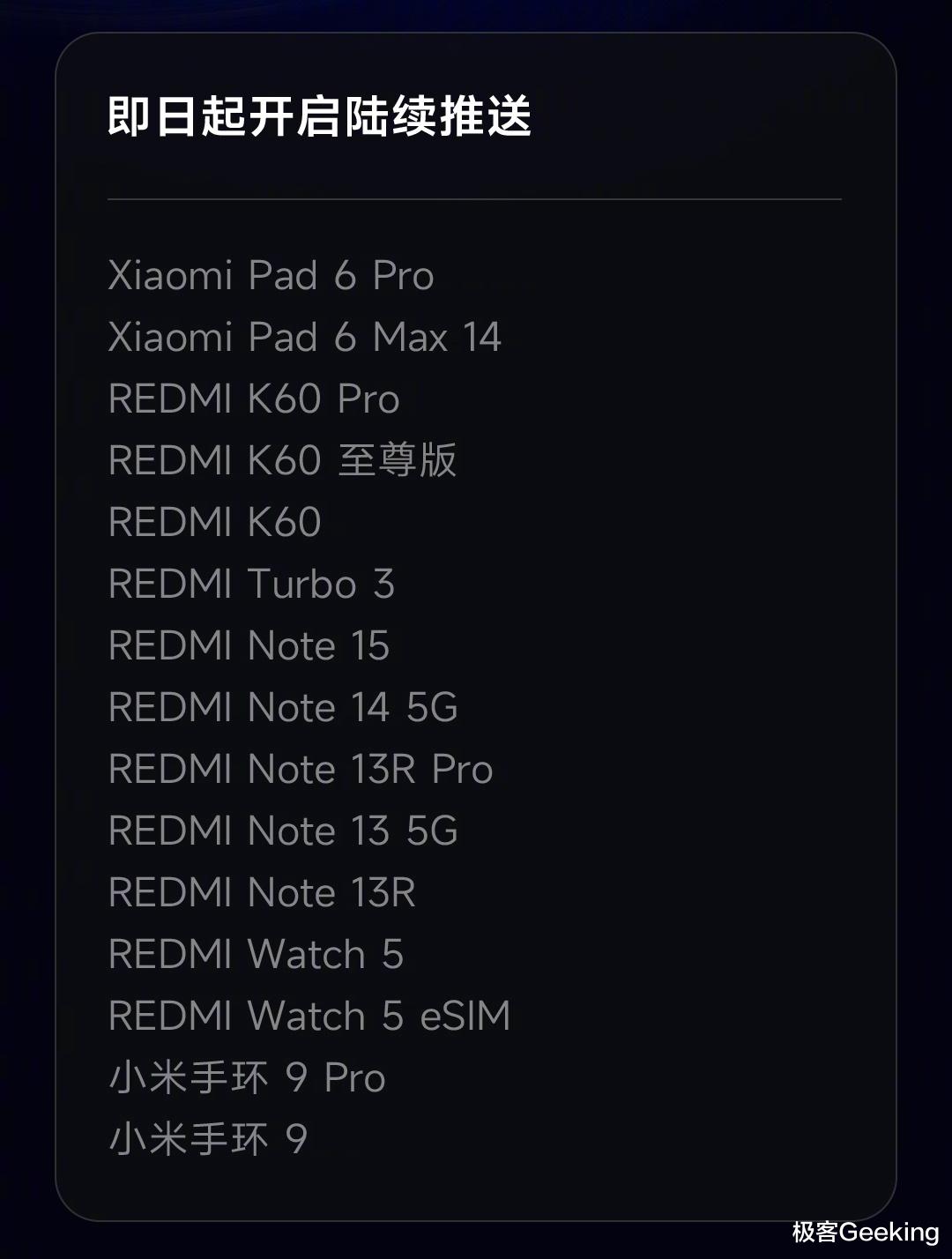 毫无疑问这也是今年澎湃OS 最后的系统升级,更多机型即将推送,这一批即将升级小米澎湃OS 3 正式版的机型共有 15 款,包括平板、手机和手环手表设备,其中以红米 REDMI 手机为主,完整的机型名单如下: