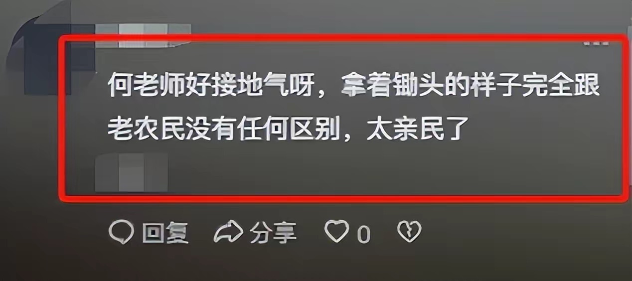也有好多网友感叹,何老师拿锄头的样子非常接地气,和普通的老农民没什么区别。她真的是一点架子都没有,原来生壶里这么亲民,就像是农村里的大妈,让人觉得温暖。