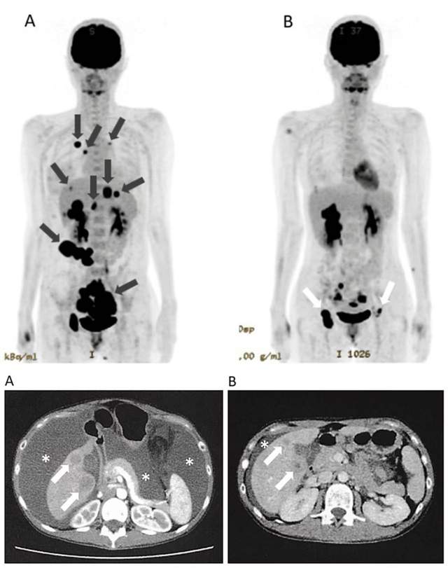 一位30多岁的女性患者,确诊时已是IV期子宫内膜癌,伴有腹膜、肝、肺、骨多处转移和大量腹水。在常规化疗效果有限的情况下,她接受了WT1-DC疫苗、高活性NK细胞联合免疫检查点抑制剂(纳武利尤单抗)的治疗。经过几个疗程,影像学复查显示,其肺转移灶和腹膜播散灶完全消失,肝转移灶显著缩小,腹水明显减少。
