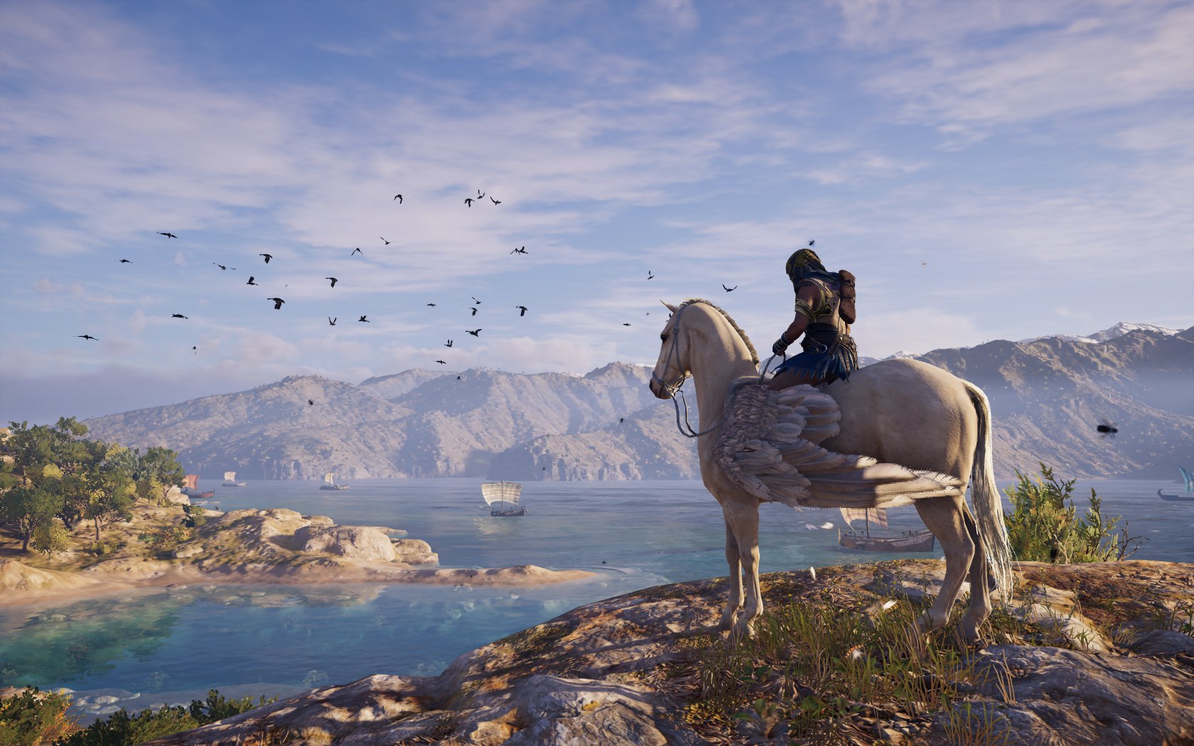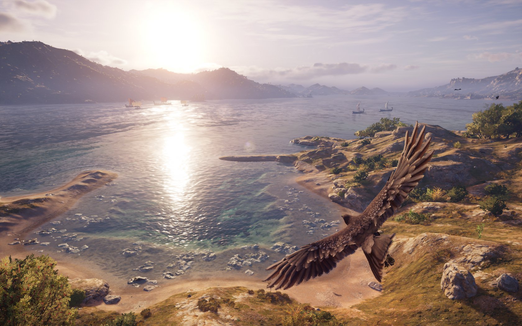 骑马沿着海岸线行进,玩家将到达乌鸦岩,这座突出的海岬曾是古代水手的导航标志。附近的福耳库斯停泊处是伊萨基岛的一处隐秘港湾,由两道海岬环绕而成,形成了一个天然的避风港。