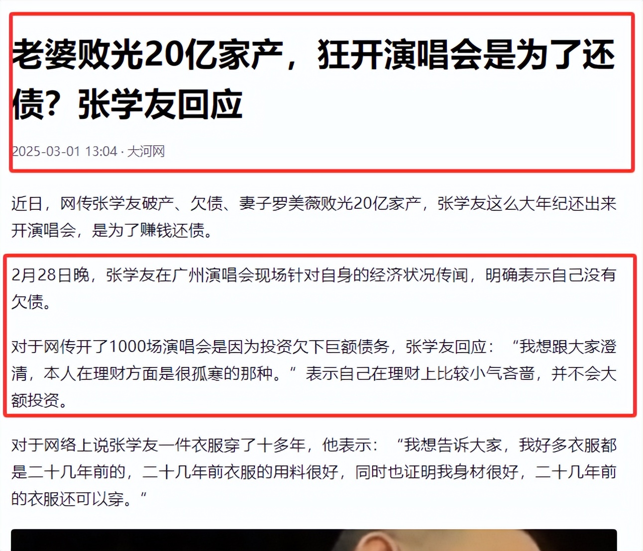 有人说罗美薇投资失败,亏了20个亿。还有人说张学友为了填补亏空,只能拼命开演唱会赚钱。
