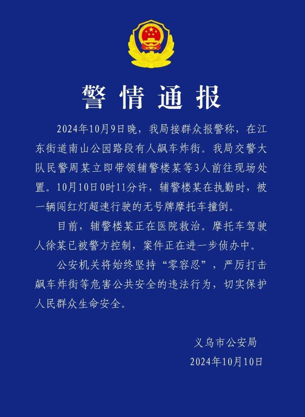 在浙江义乌的一条宽阔马路边儿上,警察同志接到了热心群众的紧急报案,举报说有一帮火力全开的机车族在深夜时分炸街炸得厉害。