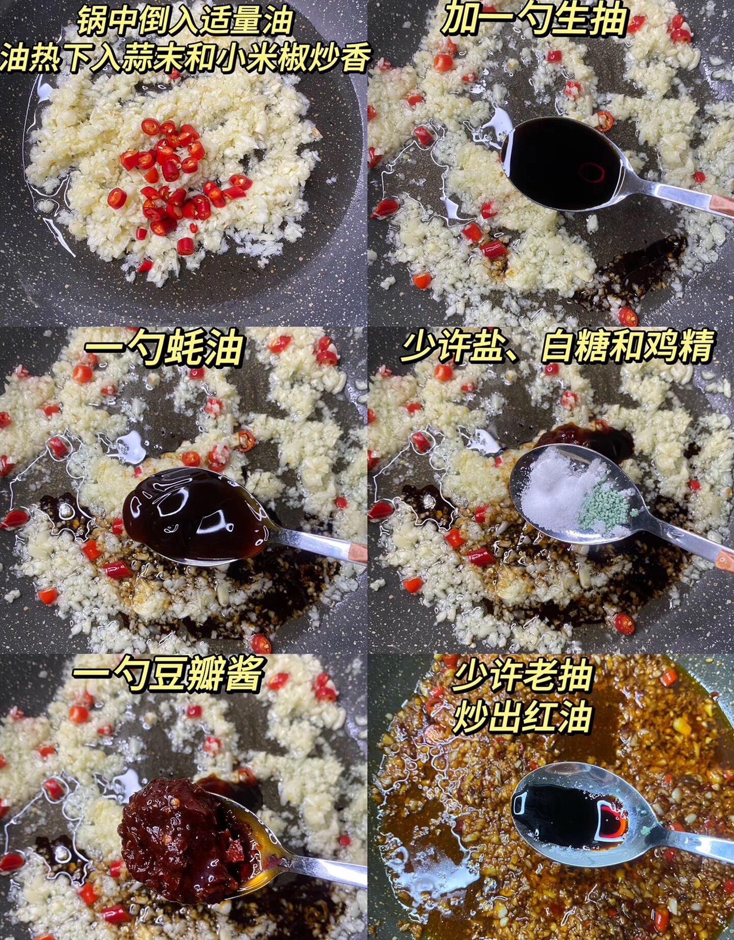 先要把蒜末和小米辣爆香,再加生抽、蚝油、盐和一勺豆瓣酱,炒到艳红香辣的时候,真正的好戏就开始了:铺上娃娃菜、金针菇和粉丝,把煮好的料均匀撒上,然后倒入开水,焖煮几分钟,浓郁的汤汁就融入到粉丝中,让我们这些“厨艺新手”也能赶紧开吃。