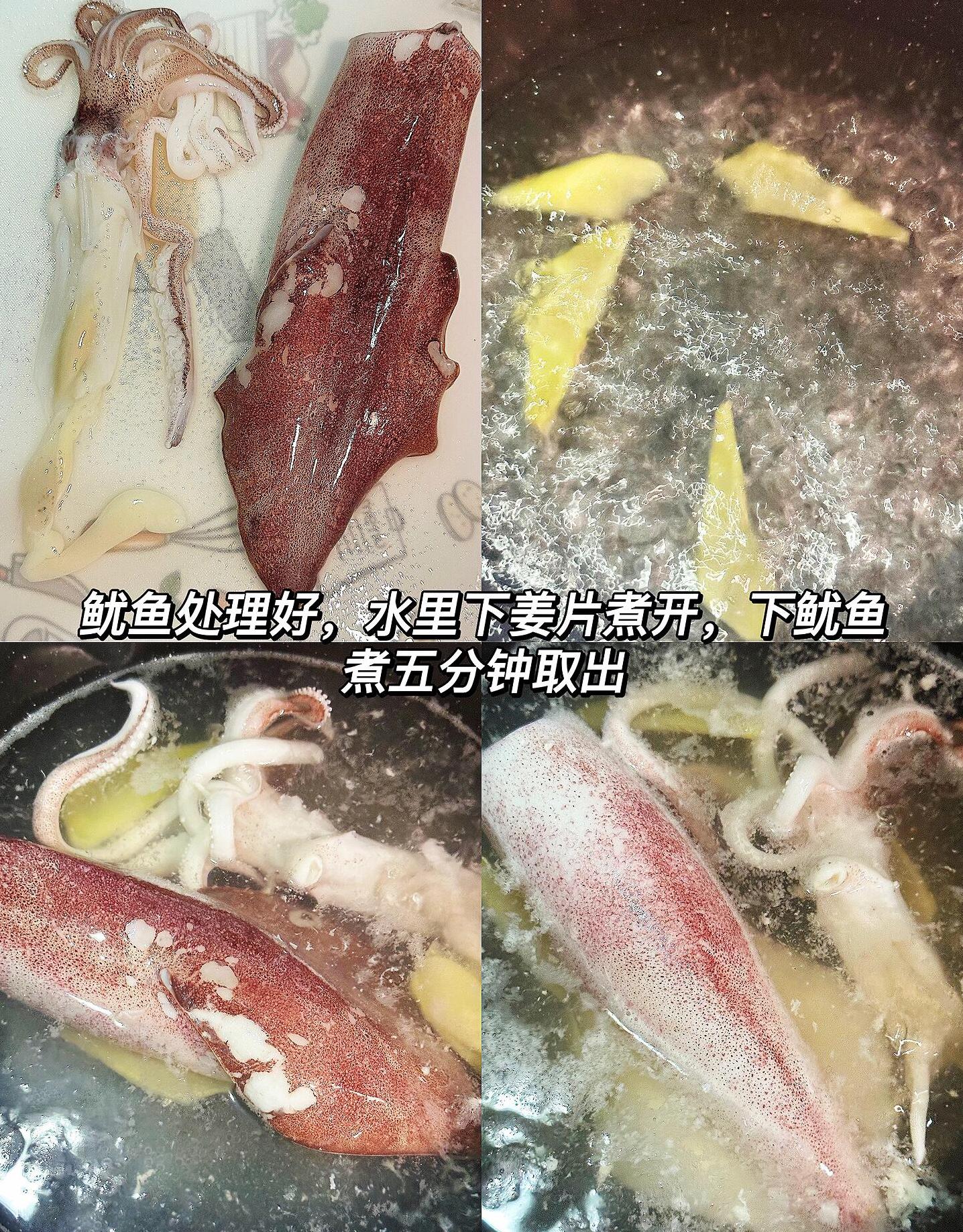 处理好鱿鱼,记得在锅里加几片姜片,非常重要,因为它去腥、增鲜。