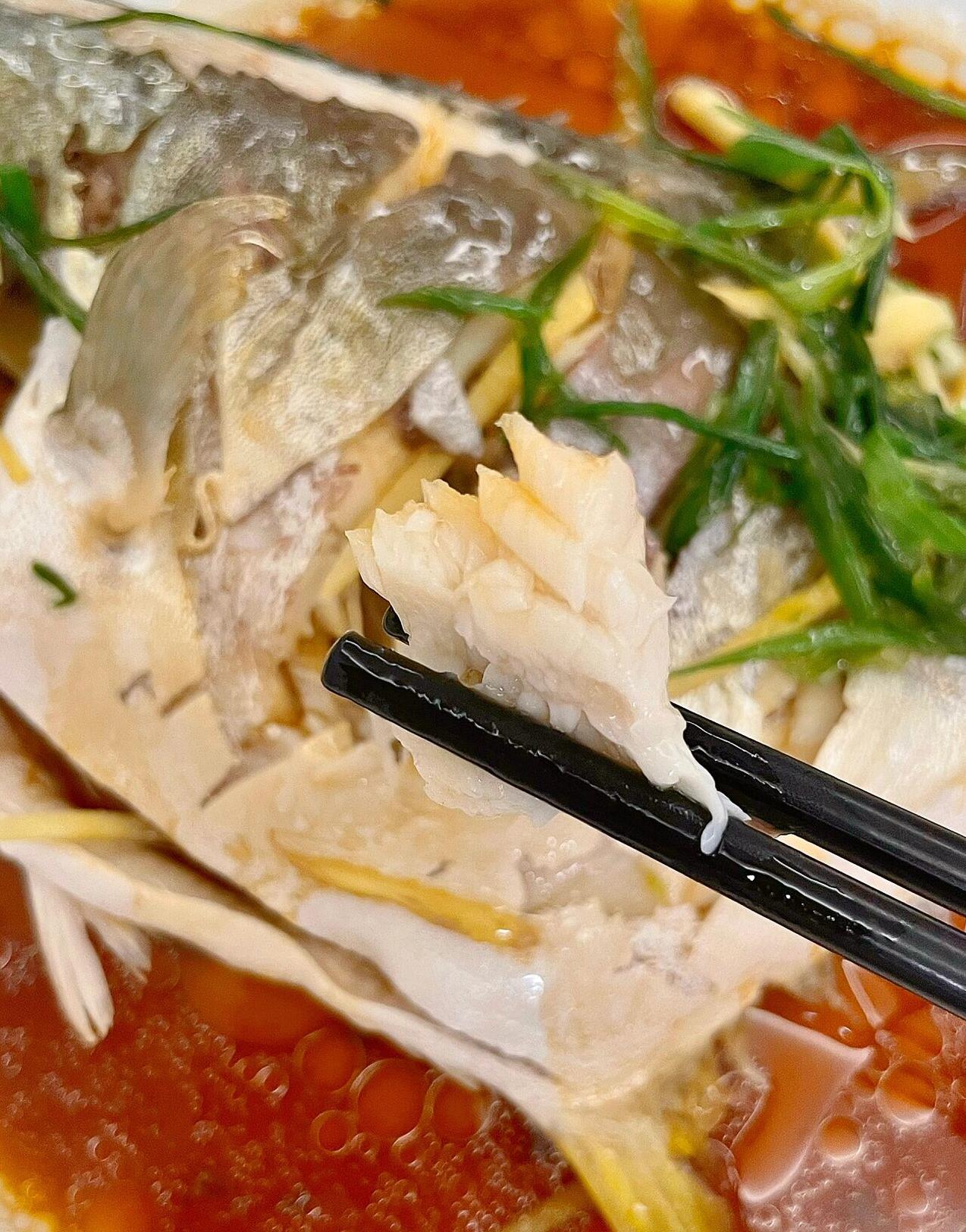 不需要花哨的调料,只需淋上蒸鱼豉油,再泼上滚烫的热油,让其激发葱丝的香味。