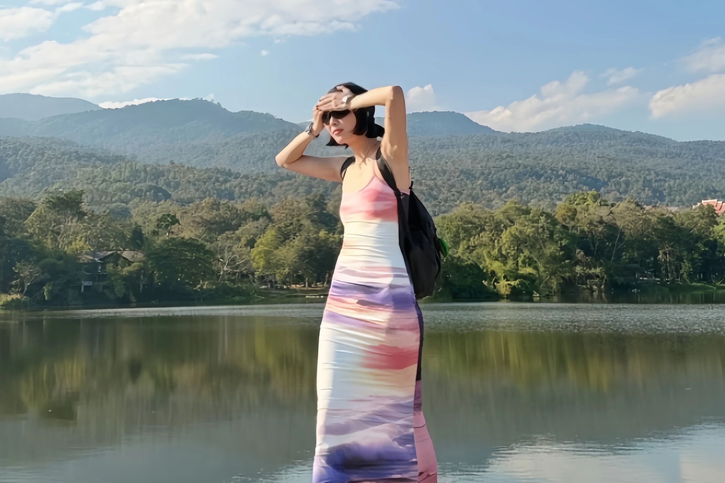 湖边这张也绝,她站在水天相接的地方,抬手遮挡阳光,胸前的线条从肩膀滑到腰臀,弧度流畅得像一幅画。远处的青山绿水都成了背景,渐变长裙在风里轻轻晃,连头发丝都透着随性的性感。