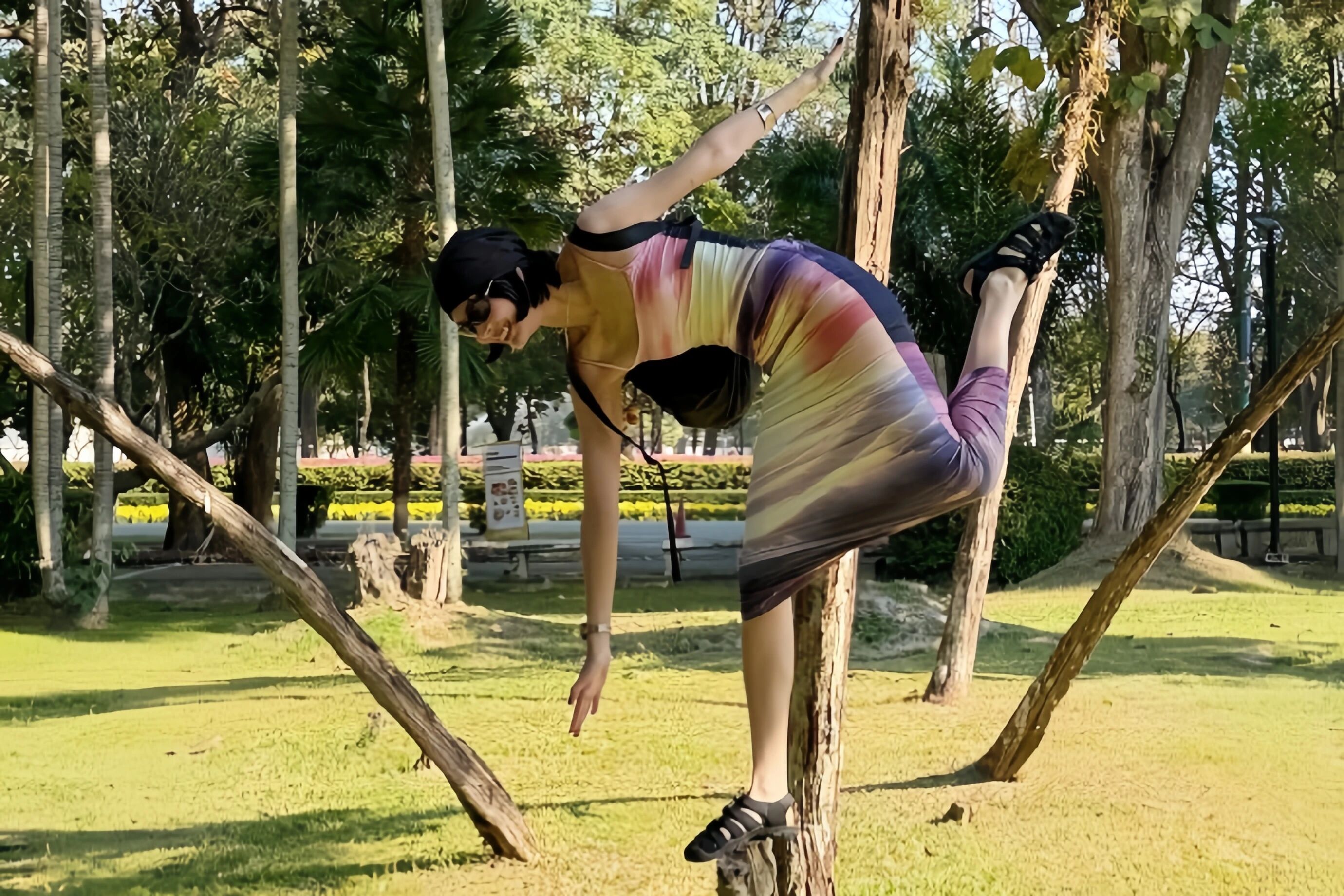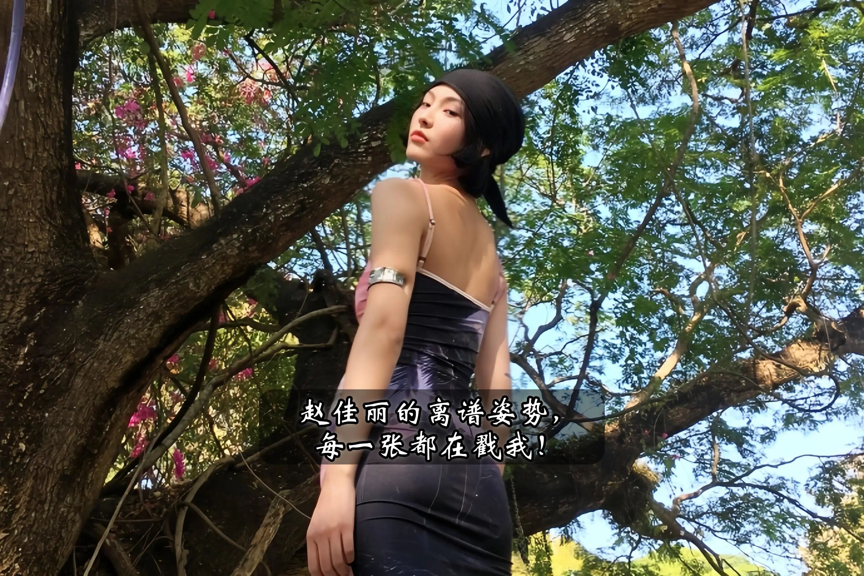 最 “抽象” 的就是树杈上的这个姿势,一只脚踩在树干,身体歪成个奇怪的角度,手臂还伸得老长,像个刚从漫画里蹦出来的疯批美人。明明动作离谱到好笑,可她皱着嘴笑的样子,又让这个姿势变得理所当然,好像她本来就该这么玩。