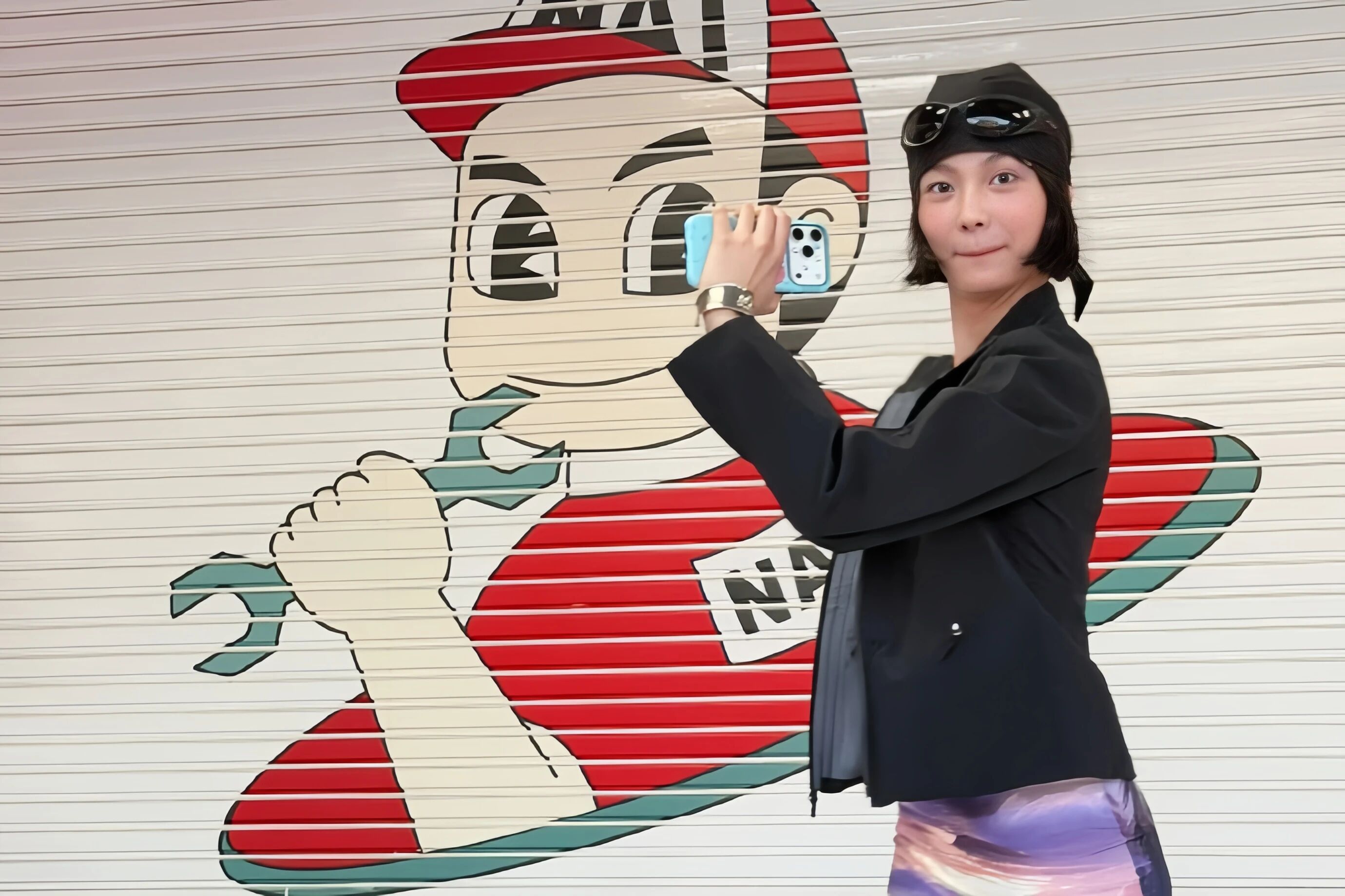 再看涂鸦墙前的这张,她套了件宽松的黑夹克,把长裙的柔美压下去几分,多了点酷飒。手机举在脸侧,对着卡通图案,夹克下摆露出的裙摆像流动的晚霞,粉紫渐变的颜色在白墙红纹的衬托下,反而更显眼了。