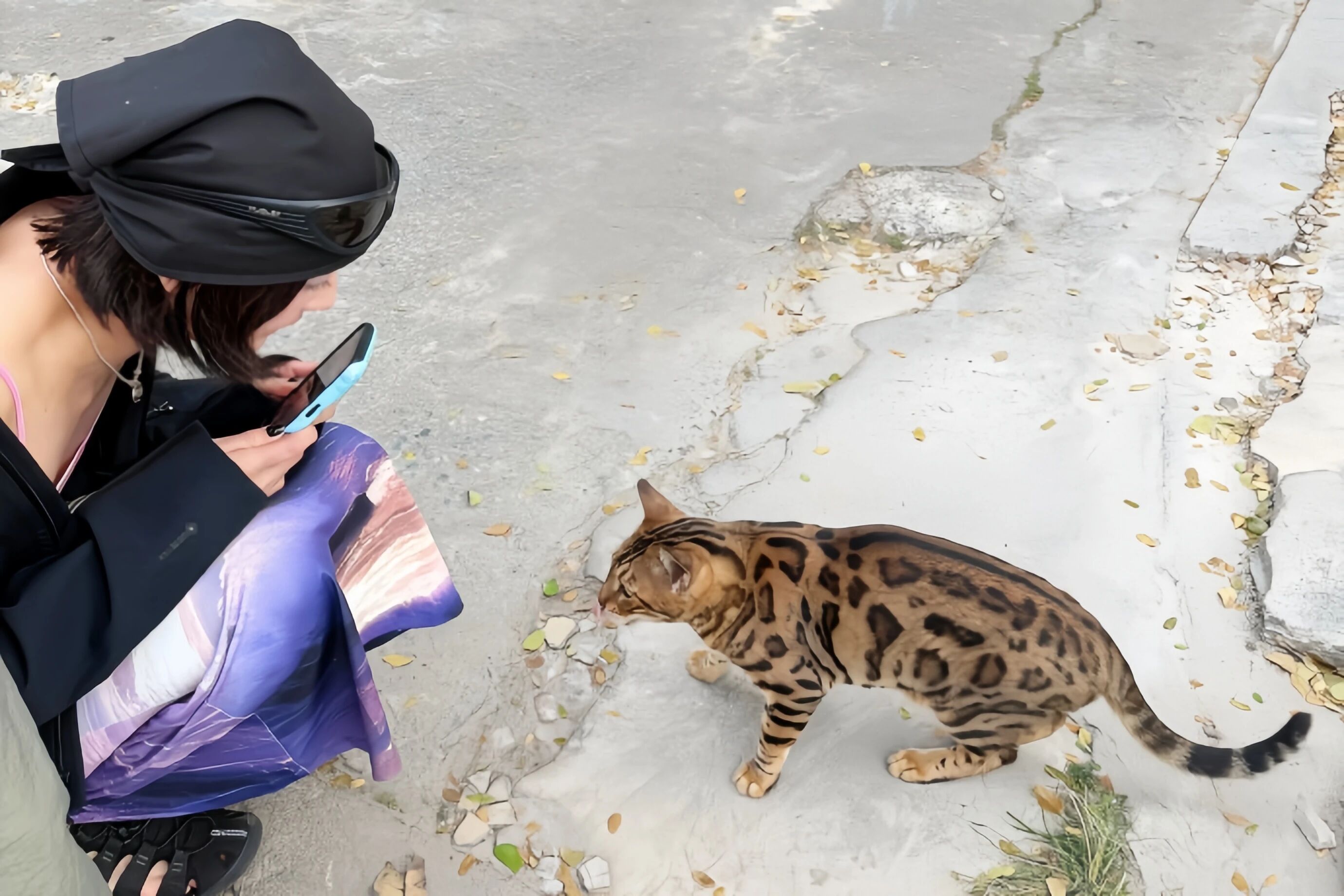 蹲在地上和豹猫互动的画面,又软又甜。她低头盯着小猫,手机举在手里准备拍,侧脸的线条软乎乎的,黑夹克裹着的裙摆露出一角粉紫,酷感和温柔撞在一起,让人忍不住跟着笑。