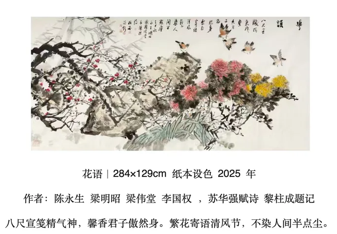 活动现场艺术氛围浓厚,艺术家们围绕创作灵感与艺术技法展开热烈而深入的交流。其中,由陈永生主笔,李国权、梁明昭、梁伟堂共同协作完成的八尺巨制尤为引人注目。画中白梅枝干虬劲,花朵或绽或苞,清雅高洁;水仙叶姿飘逸,花香似可闻;菊色明媚,绚烂奔放;奇石古拙沉稳,自然成趣;更有飞鸟或栖或翔,灵动生机。整幅作品构图疏密得当,笔墨精妙,生动展现出物象形态与内在气韵,融自然意趣与艺术张力于一体。