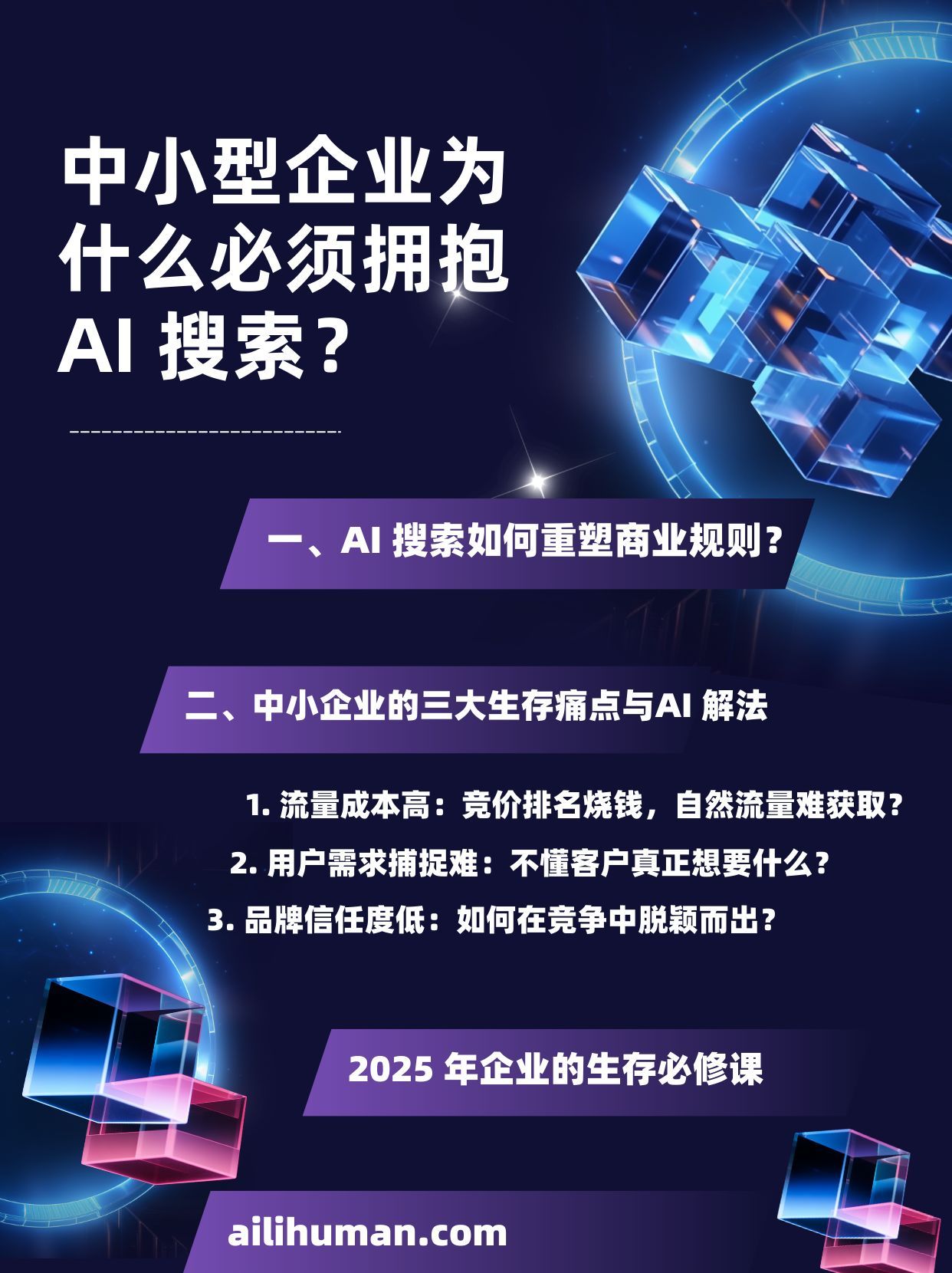 在数字化浪潮席卷全球的今天,AI 搜索早已不是科技巨头的专属工具,它正成为中小型企业破局市场的 “关键武器”。但为什么中小企业必须重视 AI 搜索?这背后藏着深刻的商业逻辑与技术原理。