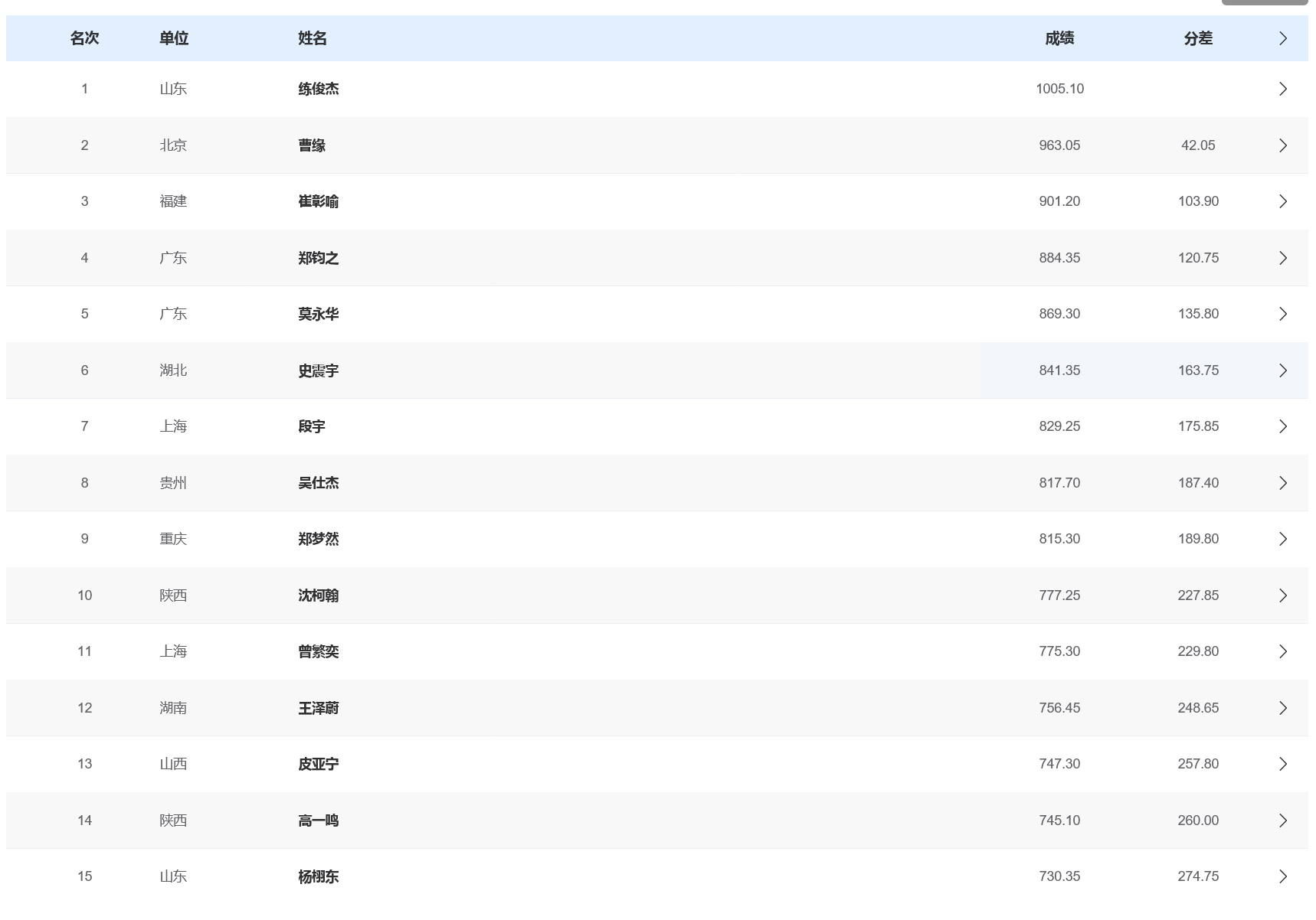 此役精彩角逐,山东名将练俊杰综合表现更稳,以1005.10分的成绩夺得金牌,一扫上届三项银牌的遗憾。曹缘963.05分获得银牌,福建选手崔彰喻901.20分获得铜牌。