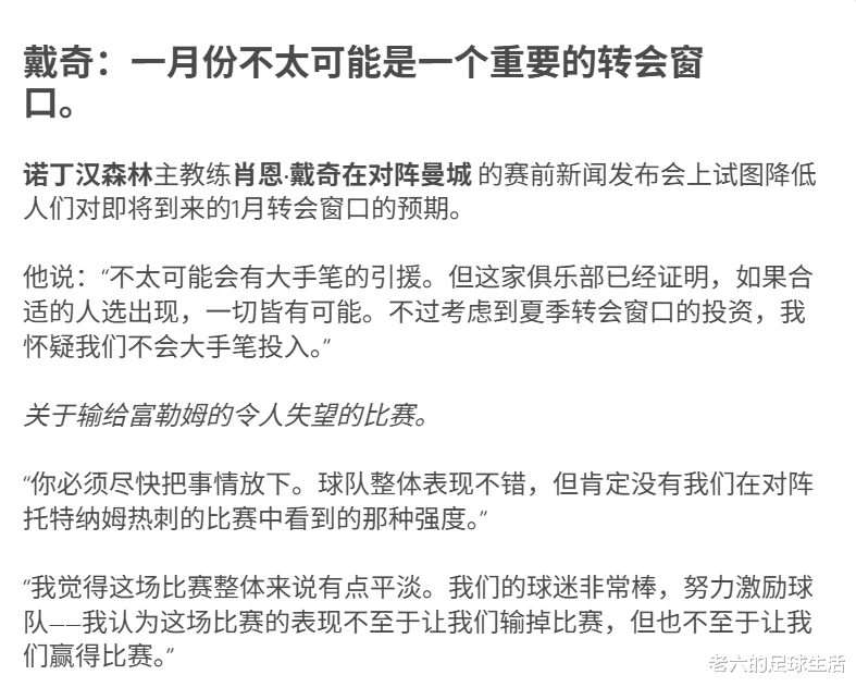 尤其上场与富勒姆的比赛,戴奇赛后谈到球队缺乏强度和紧迫感,跟此前3-0热刺的比赛球员状态完全不同,但两场比赛阵容也出现了变化,比如核心后腰桑加雷去了非洲杯。