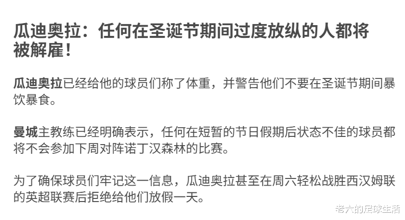 并警告球员们不要在节日期间暴饮暴食,而且为了让他们记住这一点,在战胜西汉姆联后没有给球员们放假,本场比赛凡是超重的球员都无法上场比赛。