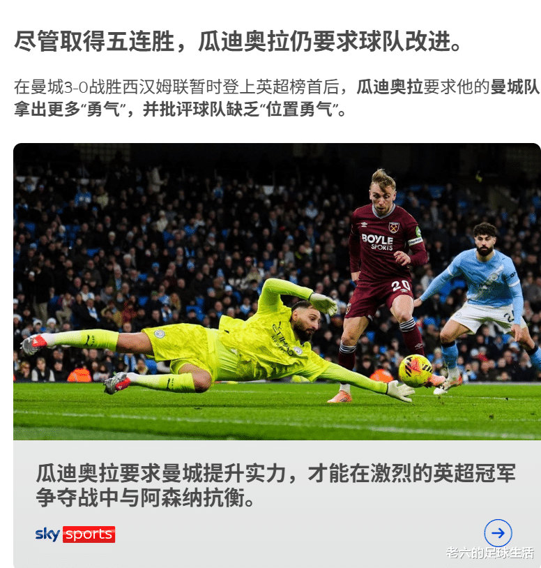 尽管现在球队的成绩非常不错,但瓜迪奥拉依旧批评球员们缺乏勇气,他要求球员们提升能力才能进入英超争冠行列。