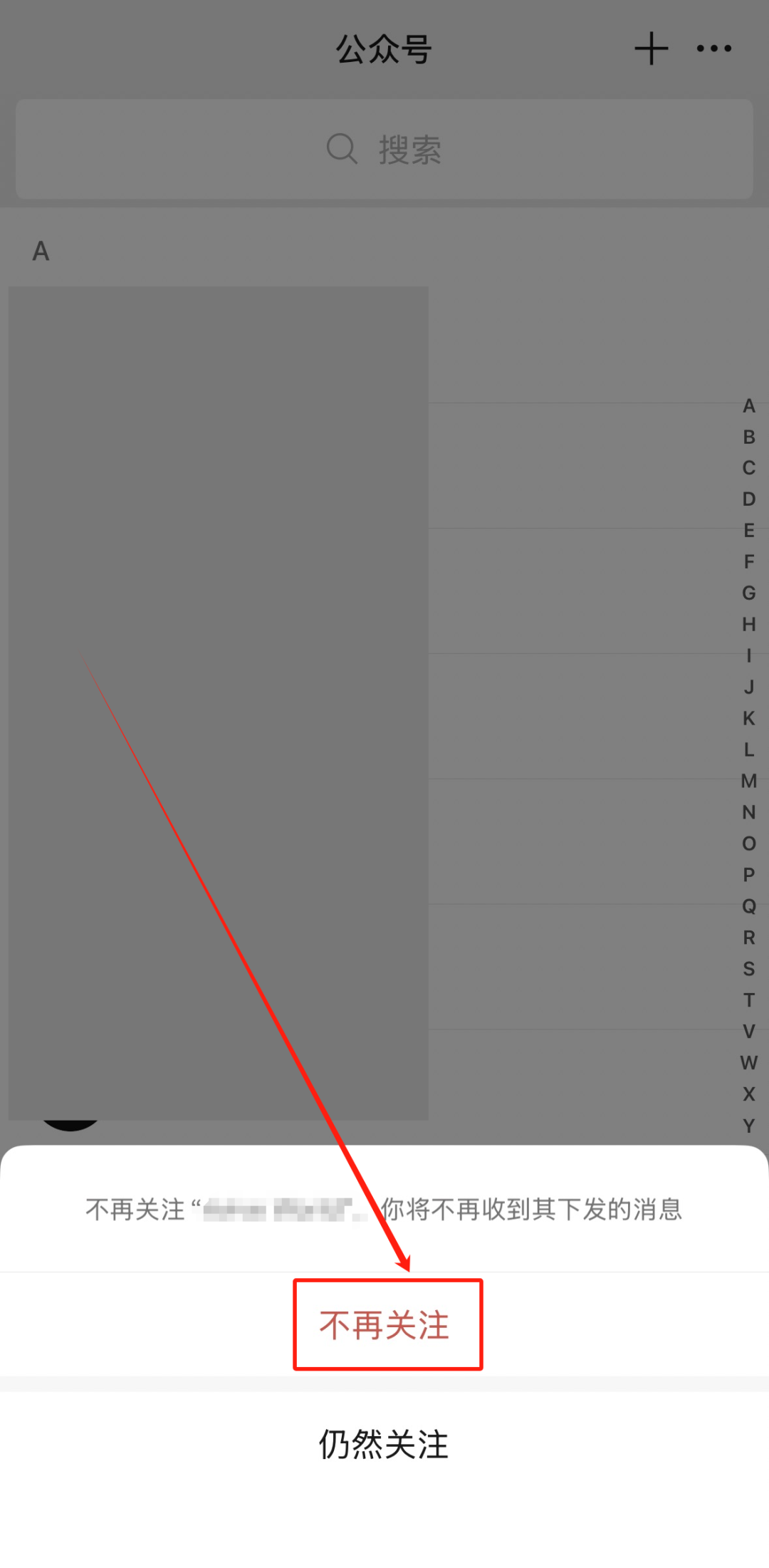 如果我们不想关注某一个公众号,可以向左滑动,点击“不再关注”选项。