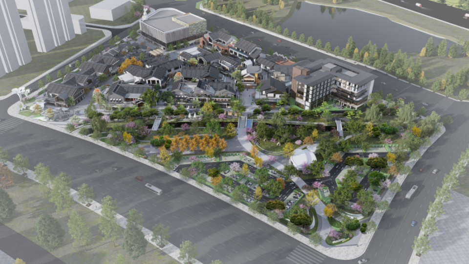 桃溪里商业街总占地82亩、总建筑面积5.15万平方米,由9栋商业单体、1栋酒店及1栋商业综合体共11栋框架结构建筑组成,预计2026年6月底实现全面竣工交付。