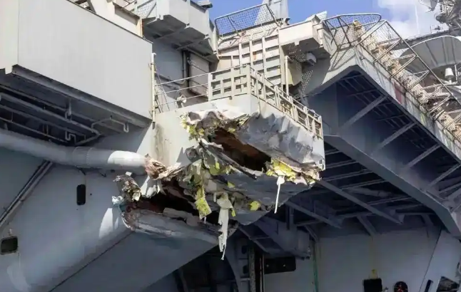 美国“动力”网站分析,这种损伤位置表明,它撞上了“杜鲁门”号航母飞行甲板外延支撑部分,至少说明这次航母大概率是“受害者”。但不管怎么说,一艘航母被巨型货轮撞上,这可不是什么光彩的事。