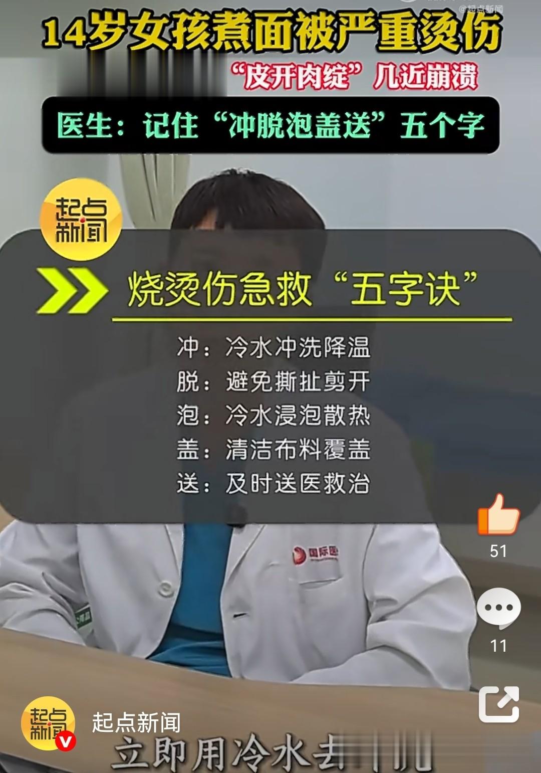 官方提醒:烫伤急救,请牢记这五个字!针对这起令人痛心的事件,起点新闻在报道中再次向公众科普了烧烫伤急救的黄金法则——“冲、脱、泡、盖、送”这五个字。这也是全国多家医院烧伤科反复强调的救命口诀: