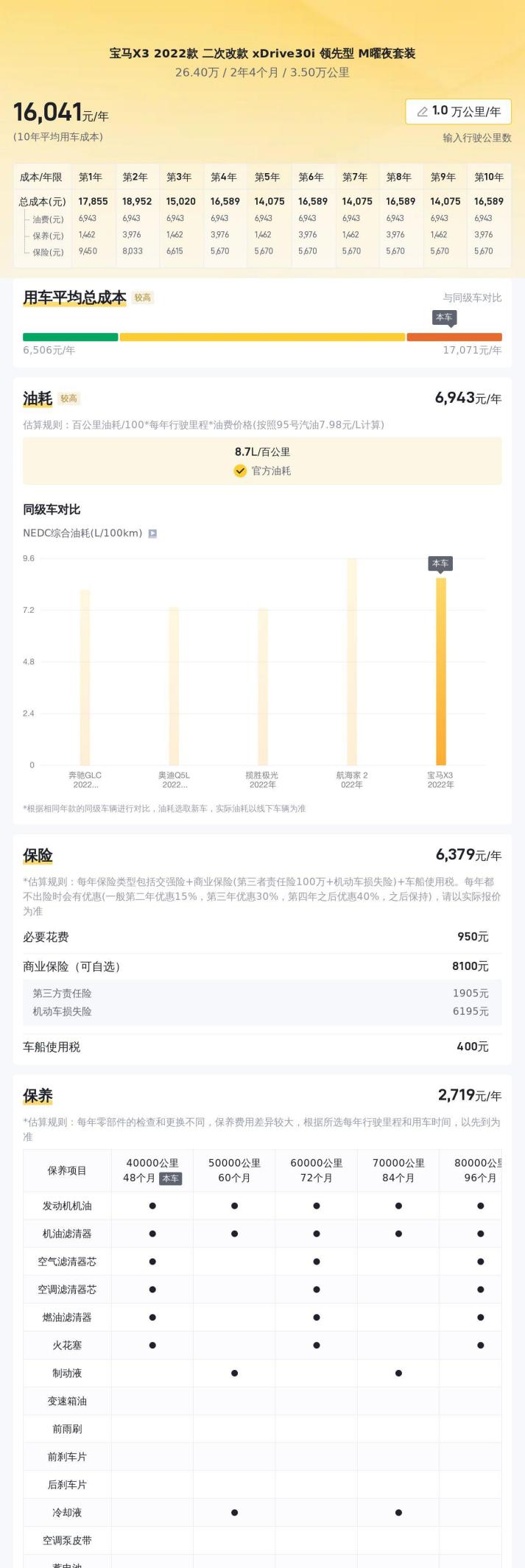 接下来,我们来谈谈用车成本。根据官方数据,这辆X3的百公里油耗为8.7L。按照目前的油价计算,每百公里的油费大约在70元左右。当然,实际油耗会受到驾驶习惯、路况等因素的影响。除了油费,我们还需要考虑保险、保养和维修等费用。由于是二手车,后期的维修费用可能会更高。因此,在购车之前,我们需要做好充分的预算,避免后期用车成本过高。