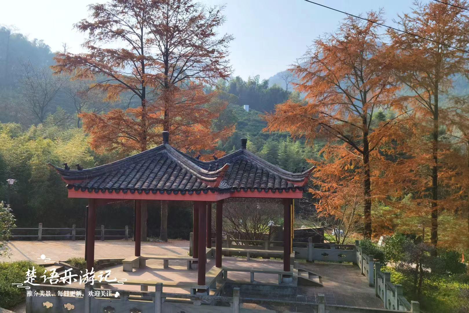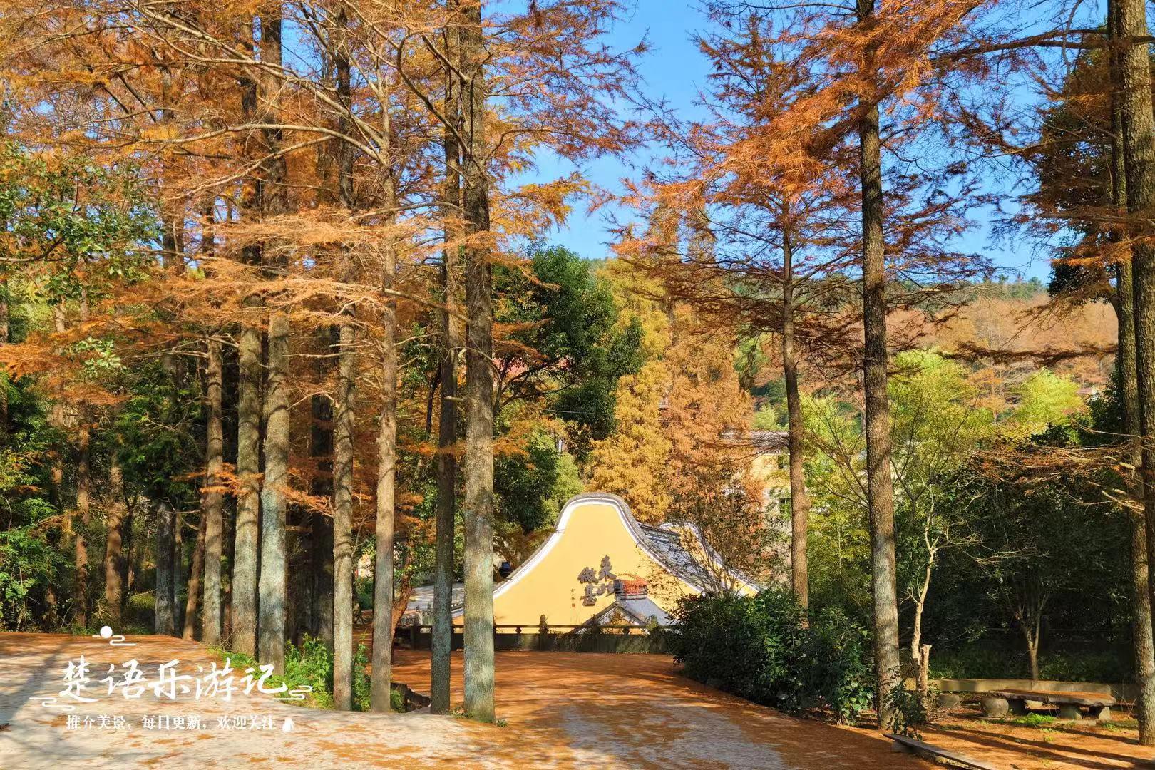 弥陀禅寺始建于唐咸通年间,历史悠久。这座古寺建在半山之间,寺院前面有一个很大的放生池,水边长满金钱松。这些金钱松高大且笔直,秋冬时节满树金黄,美不胜收。