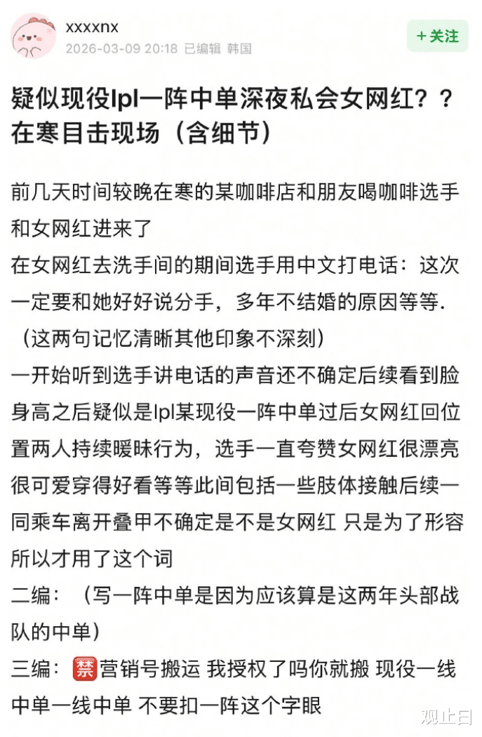 豆瓣爆料:时间线太巧了就在官宣前一天,豆瓣有网友爆料:在韩国某咖啡店遇到LPL一线中单深夜私会女网红,用中文打电话说“这次一定要和她好好说分手”,还提到多年不结婚的原因。