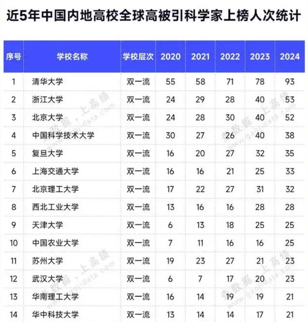 从各校拥有的被引科学家数量看,国内高校的格局在悄然变化;以这样的趋势发展下去,华五与top都有可能被破局。南大工科再不发力,已经守不住“华五”的大门了;后面武大、华科、北理与北航在虎视眈眈,欲取而代之!