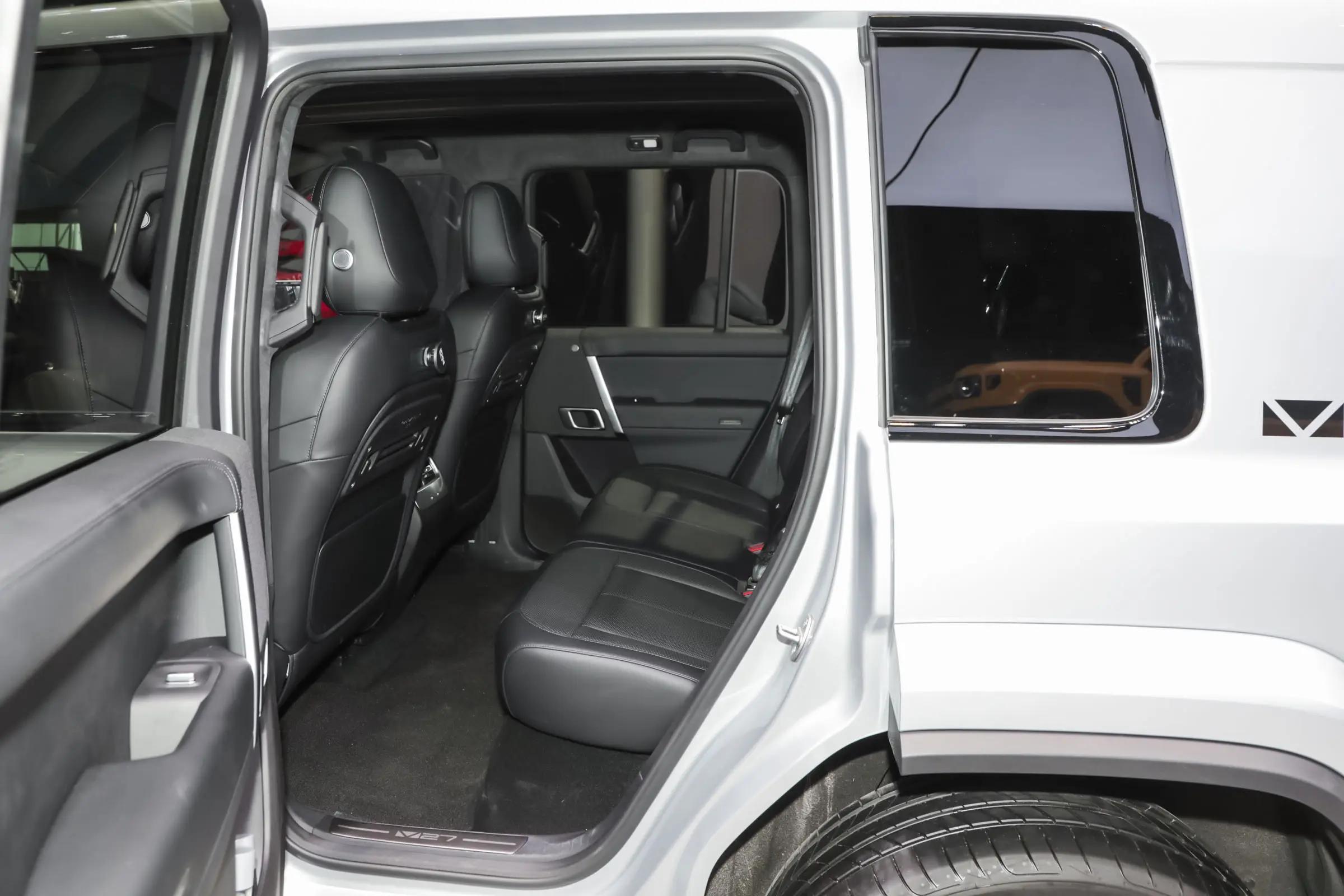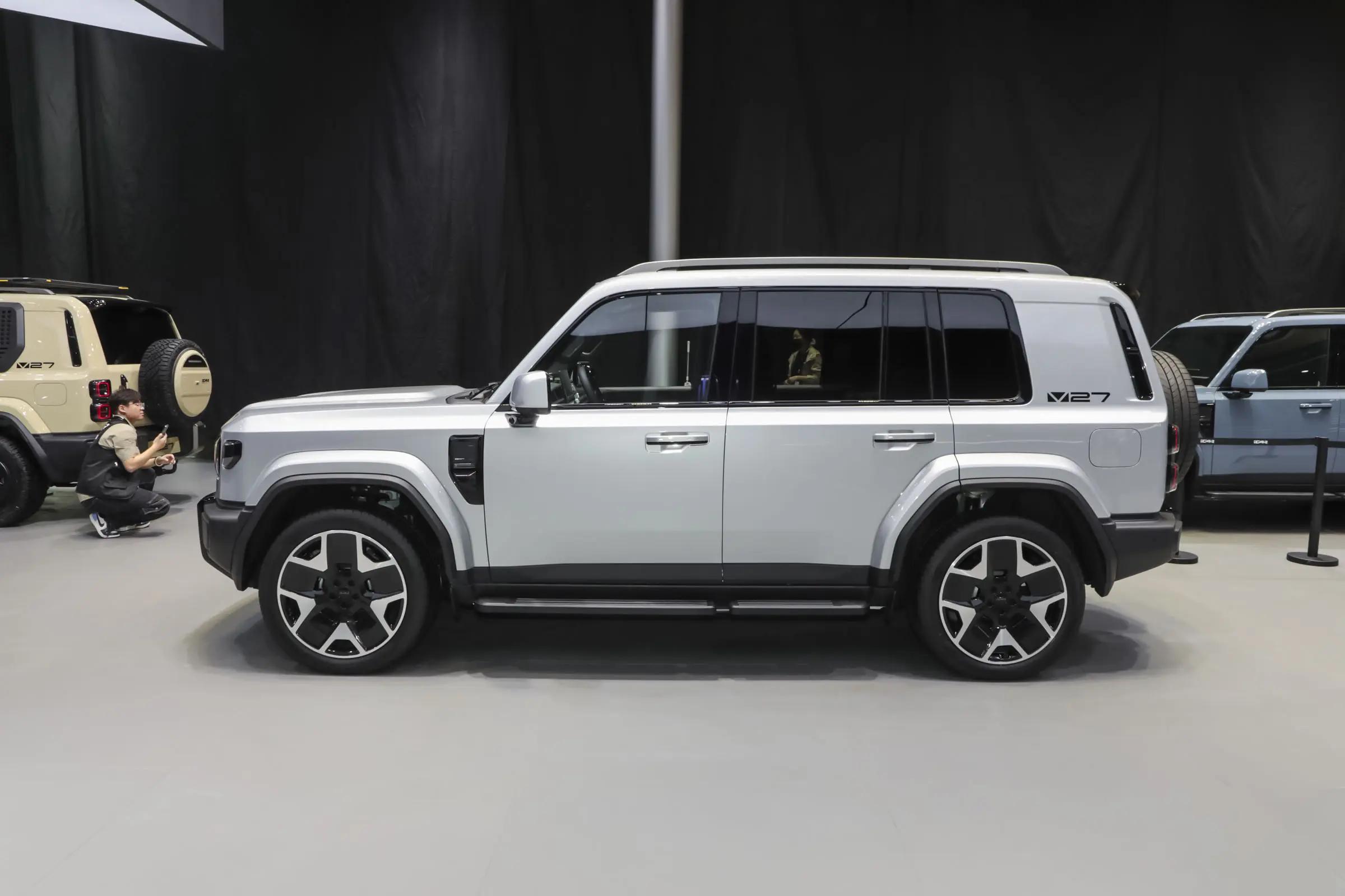 车身侧面为标准的方盒子造型,平直的车顶保证了车内能够有充裕的头部空间,如大部分硬派越野车一样,iCAR V27前后轮眉向外突出并带有棱角分明的造型,不过265/45R21尺寸的轮胎告诉了我们,这仍是一台偏向城市工况使用的SUV车型。