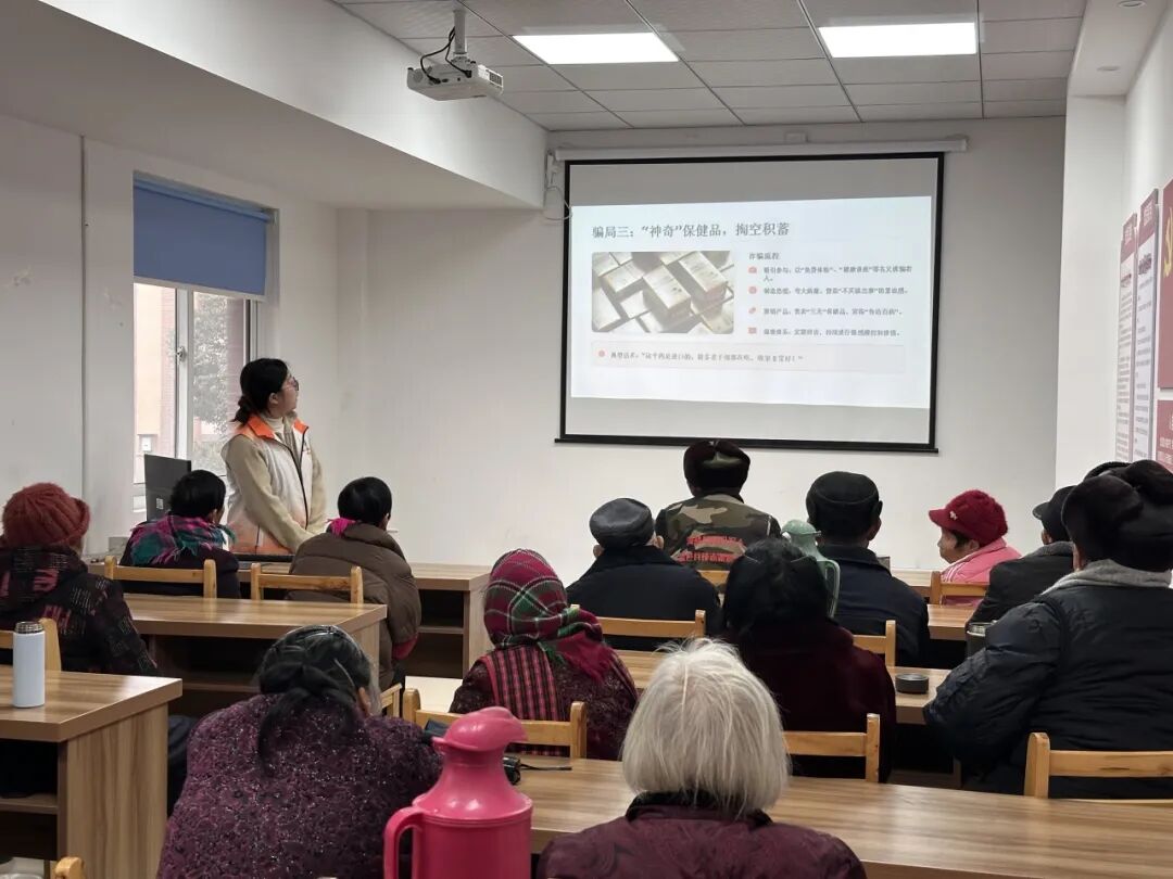 社工以PPT讲解的形式开展了养老反诈专题宣传。社工结合近期高发的养老诈骗典型案例,用通俗易懂的方言和生动的图片,详细拆解了“保健品诈骗”“养老投资诈骗”“冒充亲属借钱”等常见诈骗套路,清晰告知老人们诈骗分子的惯用伎俩、识别方法和防范技巧。