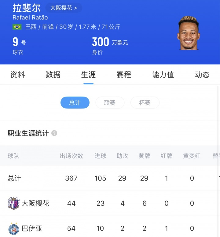 在巴伊亚时,拉唐的数据不算太好,出场54次打进10球,这进球效率并不高。也可能是拉唐的身体条件+技术能力更适合混东亚联赛吧。