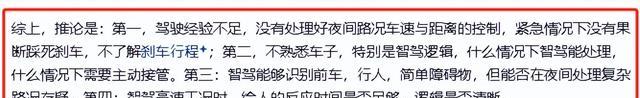 还有网友结合小米给出的一部分调查结果进行了推论,认为这名司机的驾驶经验不足,没有处理好夜间路况车速与距离的控制,紧急情况下没有果断踩死刹车,不了解刹车行程。