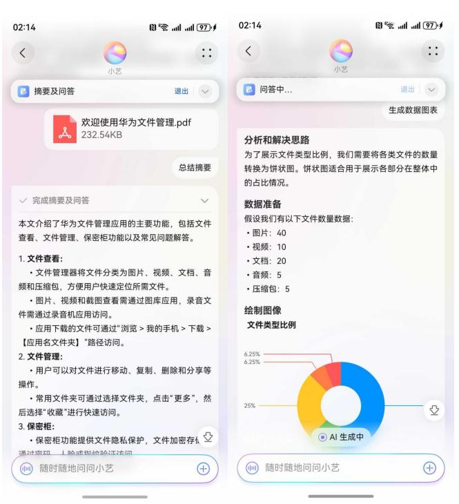 我用自己的Mate X6随便找了个华为文件管理的PDF文件试了试,小艺就直接提炼出核心信息,并且可以生成图表的形式,感兴趣的大家也可以自己尝试下。