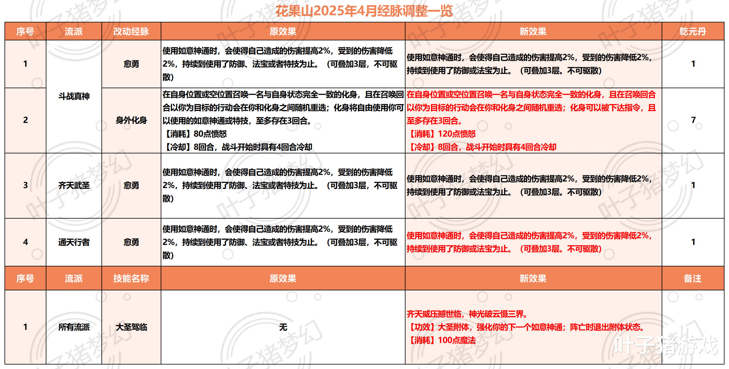花果山本次改动不仅提升了三个流派的“愈勇”效果,还增加了一个名为“大圣降临”的技能,该技能可以强化如意神通,算是变相了提升了花果山的输出能力。除此之外,“斗战真神”流派召唤出的分身由之前的随机变成了可以下达作战指令的状态,具备了成为核心输出的资格。