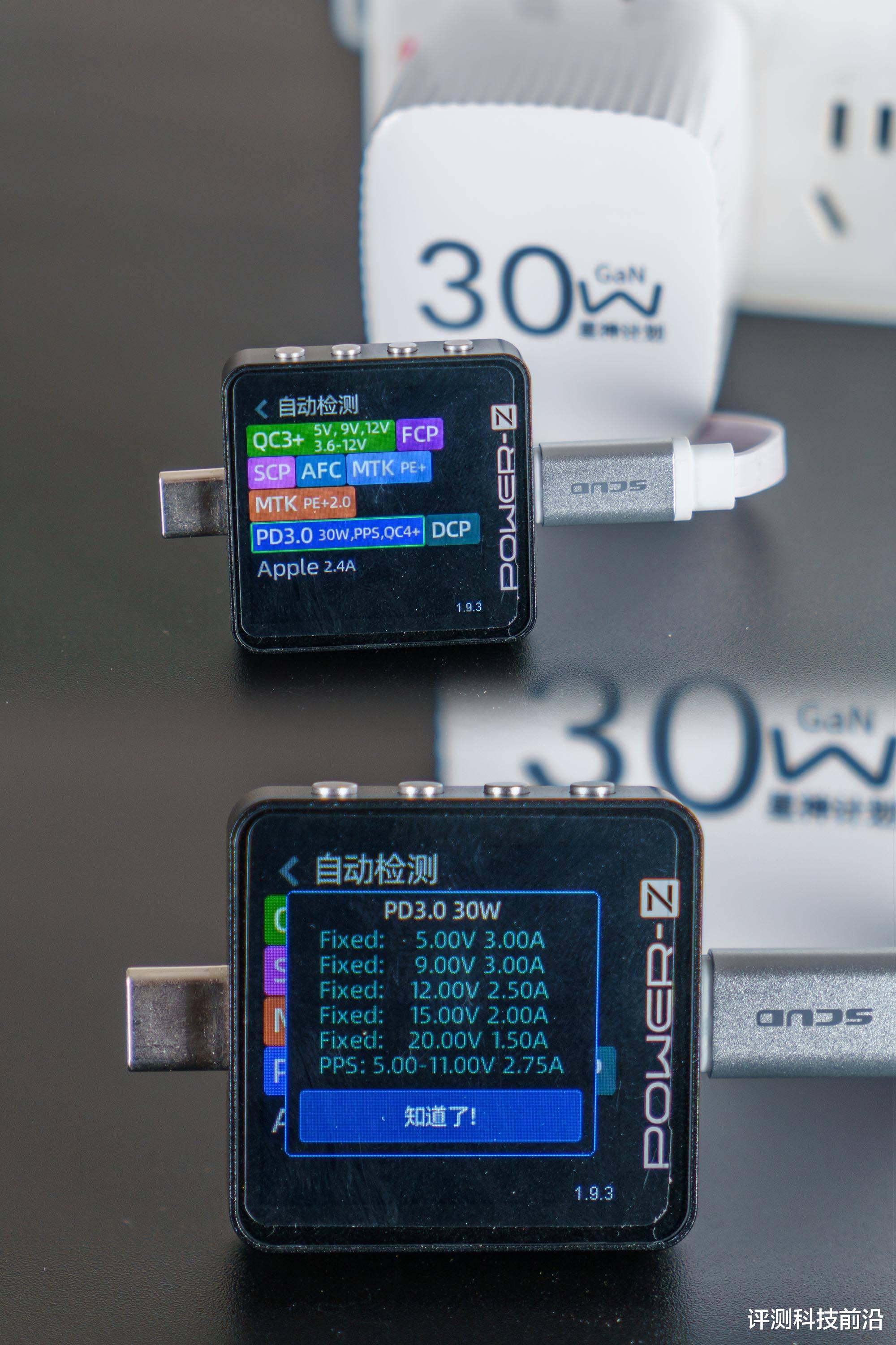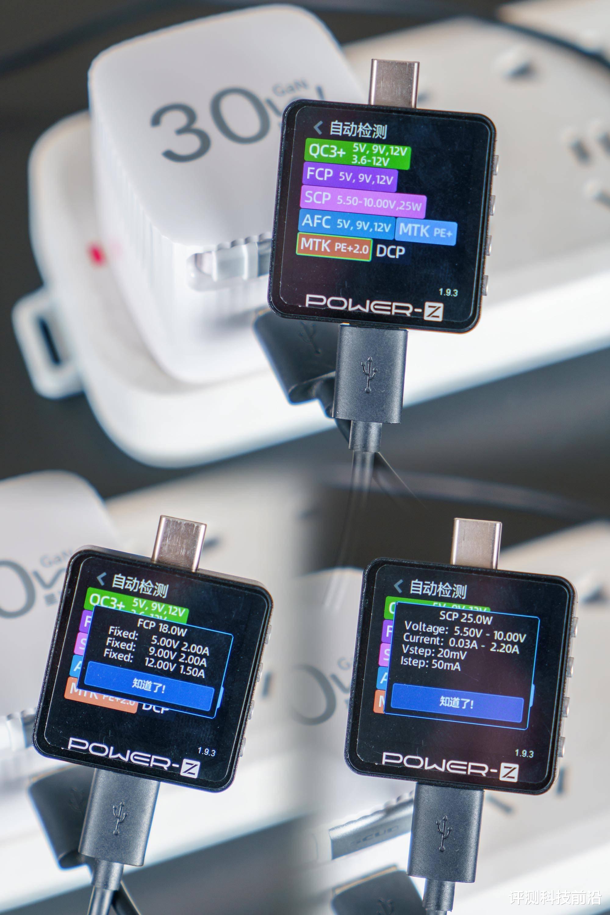 ▼用POWER-Z KM003C先测试一下伸缩线支持的快充协议,通过KM003C测试的结果可以看到伸缩线支持QC3+/4+、FCP、SCP、AFC、PD3.0、PPS、DCP、Apple 2.4A等,涵盖了市面上大部分主流设备支持的充电协议;从PDO报文可以看到它具备5V3A、9V3A、12V2.5A、15V2A、20V1.5A五挡固定电压,除此之外还有5.0-11V2.75A的PPS电压挡位,够用了