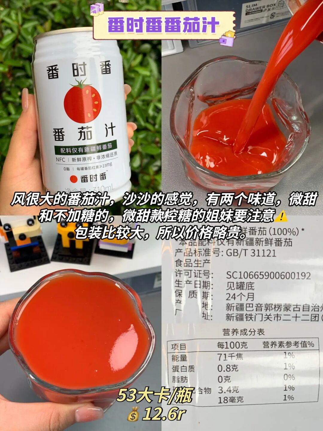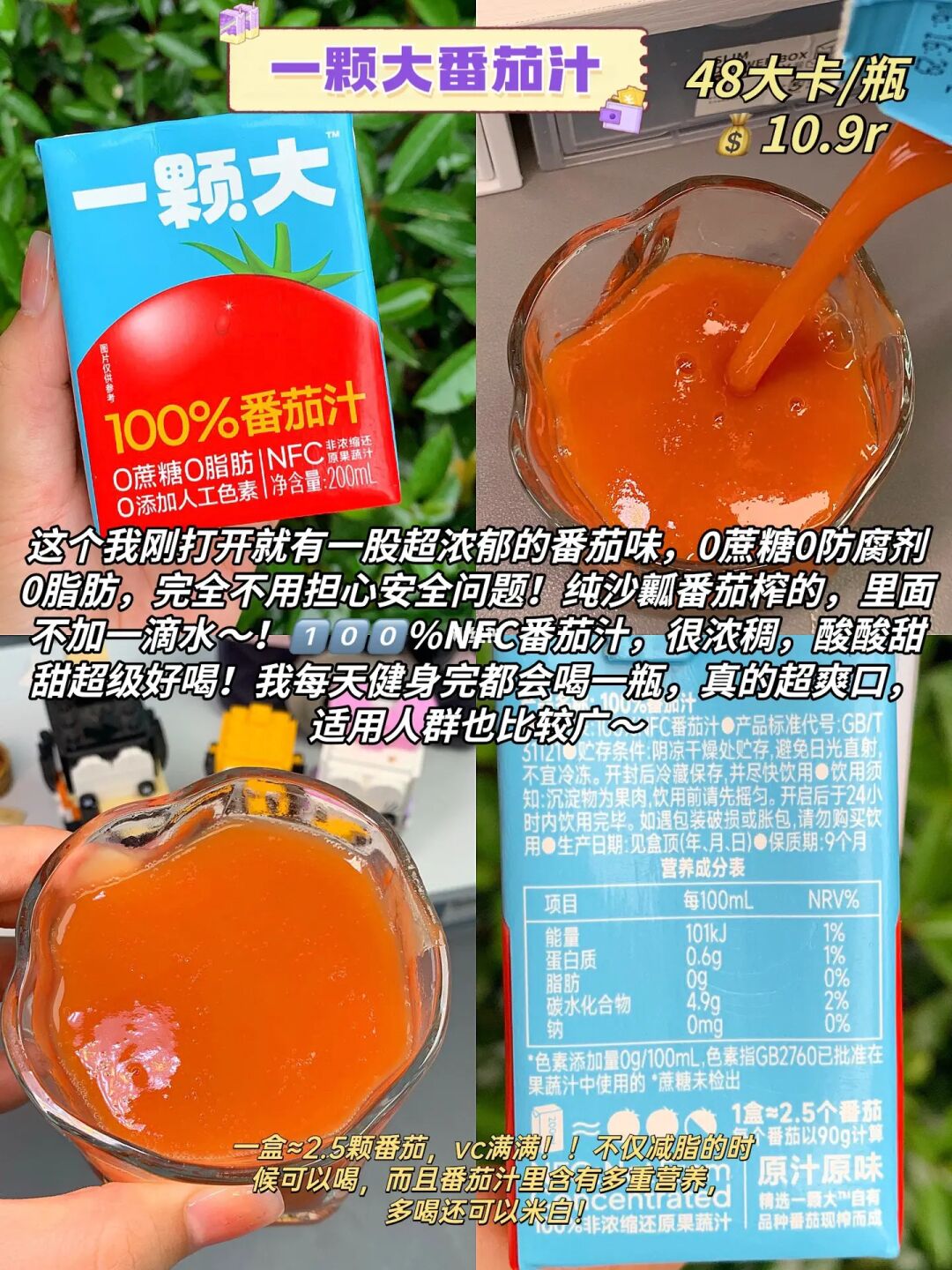 这个我刚打开就有一股超浓郁的番茄味,0蔗糖0防腐剂0脂肪,完全不用担心安全问题!纯沙瓤番茄榨的,里面不加一滴水~!1⃣0⃣️0⃣️%NFC番茄汁,很浓稠,酸酸甜甜超级好喝!一盒≈2.5颗番茄,我每天健身完都会喝一瓶,真的超爽口,适用人群也比较广,不仅减脂的时候可以喝,而且番茄汁里含有多重营养,多喝还可以米白!