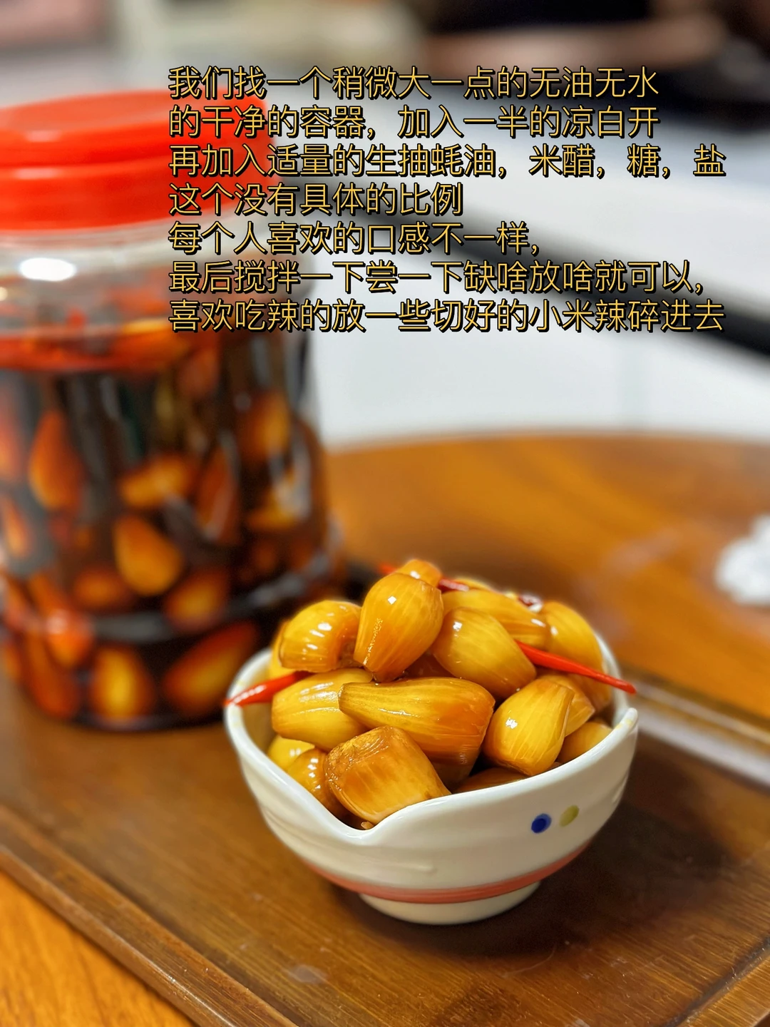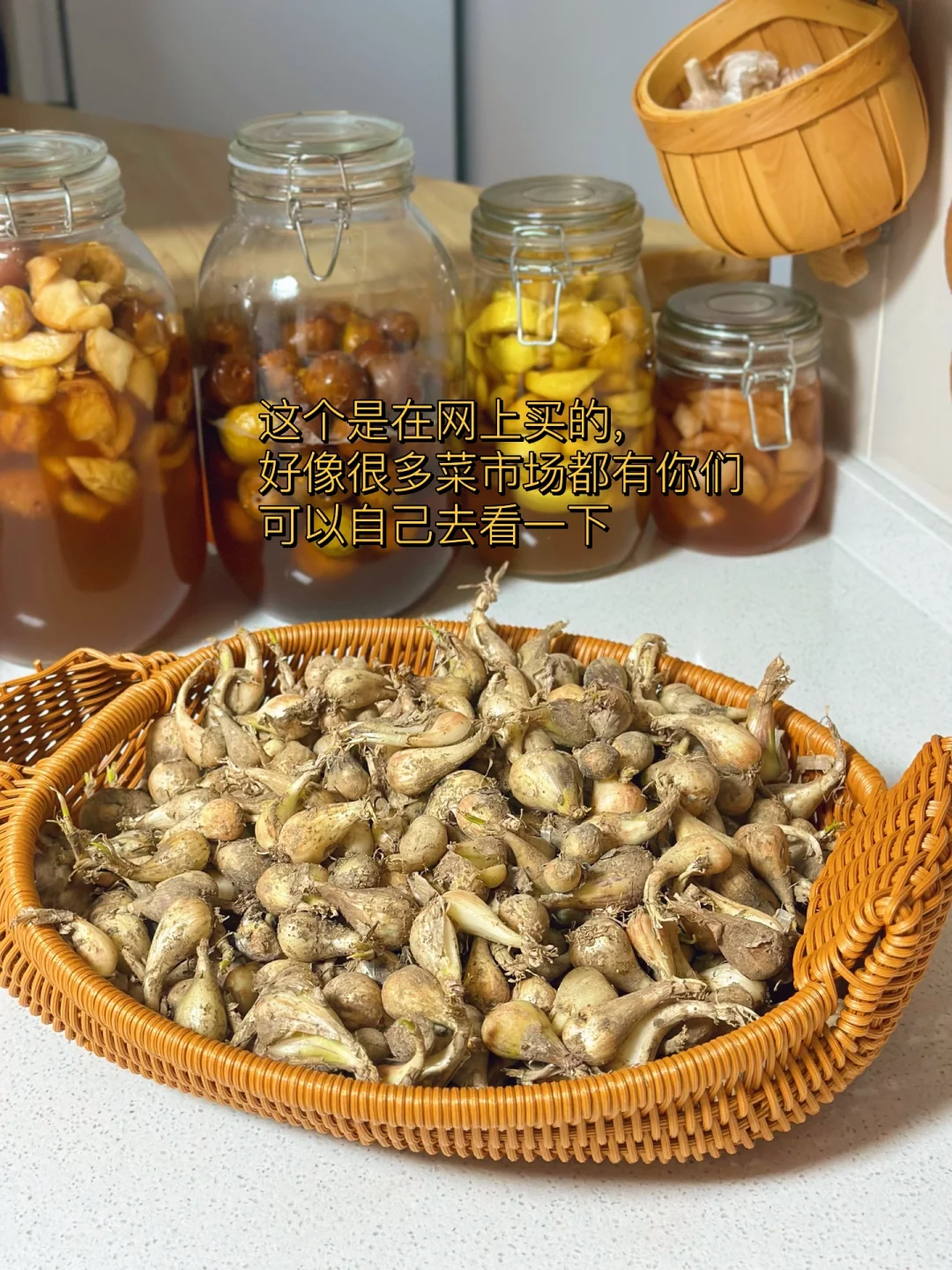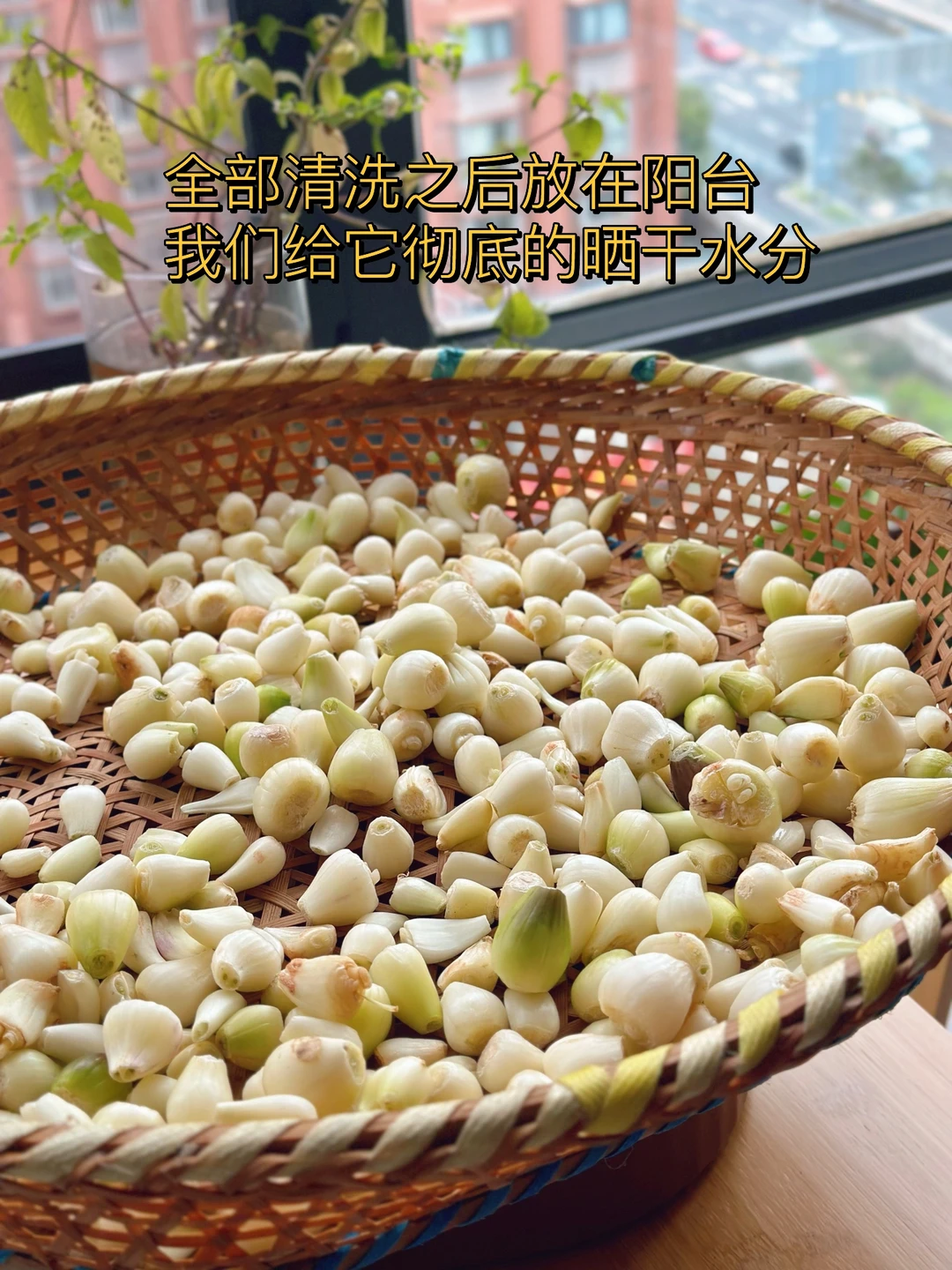 这个好像很多人都不知道,也不吃,但是喜欢的人都挺喜欢的,以前在老家的时候我和妈妈都很喜欢,只不过做法很简单,加一点点豆瓣酱生抽啥的,随便凉拌一下过一会儿就可以吃了,这次我把它泡了一下,结果是完全不一样的口感,酸辣开胃还挺脆超级开胃 1. 这个是在网上买的,好像很多菜市场都有你们可以自己去看一下 2. 我觉得清洗荞头真的是一件非常挑战的事情,用剪刀把根部和上面都剪掉,然后再把外面那一层剥掉到,后面我只能戴着眼镜弄流眼泪不止啊 3. 全部清洗之后放在阳台我们给它彻底的晒干水分 4. 我们找一个稍微大一点的无油无水的干净的容器,加入一半的凉白开再加入适量的生抽蚝油,米醋,糖,盐 这个没有具体的比例每个人喜欢的口感不一样,最后搅拌一下尝一下缺啥放啥就可以,喜欢吃辣的放一些切好的小米辣碎进去 5. 真的是配稀饭绝绝子,酸辣脆爽啊