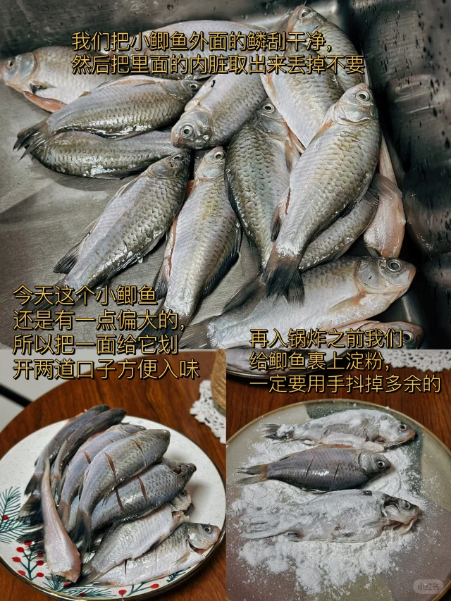 1. 我们把小鲫鱼外面的鳞刮干净,然后把里面的内脏取出来丢掉不要