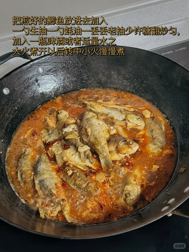 6. 把煎好的鲫鱼放进去加入一勺生抽一勺蚝油一丢丢老抽少许糖翻炒匀,加入一瓶啤酒或者适量水之大火煮开以后转中小火慢慢煮